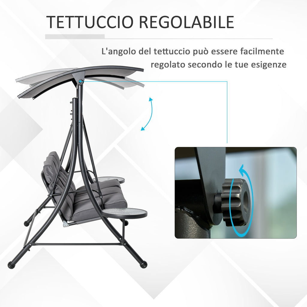 Dondolo da Giardino 3 Posti in Metallo con 2 Tavolini Grigio