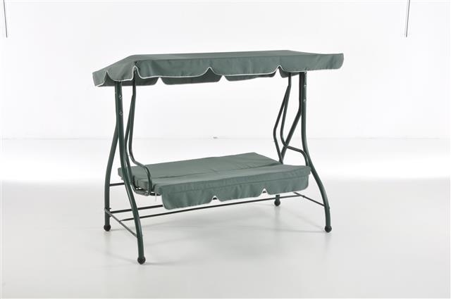 Dondolo 3 posti con schienale reclinabile, struttura in ferro verniciato a polvere colore verde (finitura opaca), tessuto cuscino seduta e schienale poliestere g 180/mq spessore cm 8 colore verde scuro, tessuto tettuccio poliestere g 180/mq colore verdescuro, cm 200 X 120 X h 174 seduta cm 47 schienale h cm 52 sezione paleria struttura portante d. mm 48/38 X 1.5/1.2 sezione paleria sostegni seduta d. mm 32/28 X 1.2 paleria tettuccio d. mm 16 X 0.8/16 X 0.6