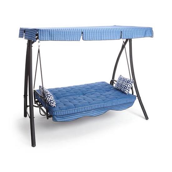 Dondolo 3 posti con schienale abbattibile, struttura in ferro verniciato a polvere colore Grigio scuro, tessuto poliestere g 180/mq colore rigato Azzurro/Blu, 2 cuscini fantasia Blu/Bianco. Ingombro cm 203 X 115 X h 170 seduta cm 168 X 54, schienale h cm 55, tettuccio cm. 198 X 115, sezione gambe mm 62 X 38 X 1.0, tubolari seduta e schienale d. mm 28.6 X 1.2, tubolari tettuccio d. mm 18 X 0.8, peso 38.7 Kgs