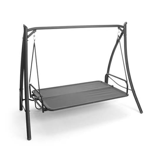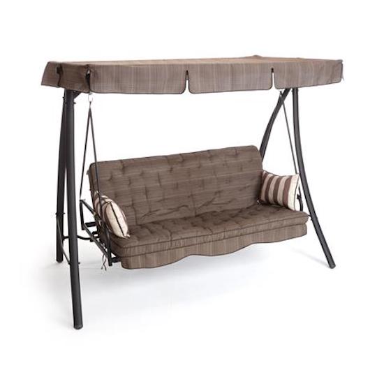 Dondolo 3 posti con schienale abbattibile, struttura in ferro verniciato a polvere colore Marrone scuro, tessuto poliestere g 180/mq colore Marrone scuro, 2 cuscini colore Marrone/Beige rigato. Ingombro cm 203 X 115 X h 170 seduta cm 168 X 54, schienaleh cm 55, tettuccio cm. 198 X 115, sezione gambe mm 62 X 38 X 1.0, tubolari seduta e schienale d. mm 28.6 X 1.2, tubolari tettuccio d. mm 18 X 0.8, peso 38.7 Kgs