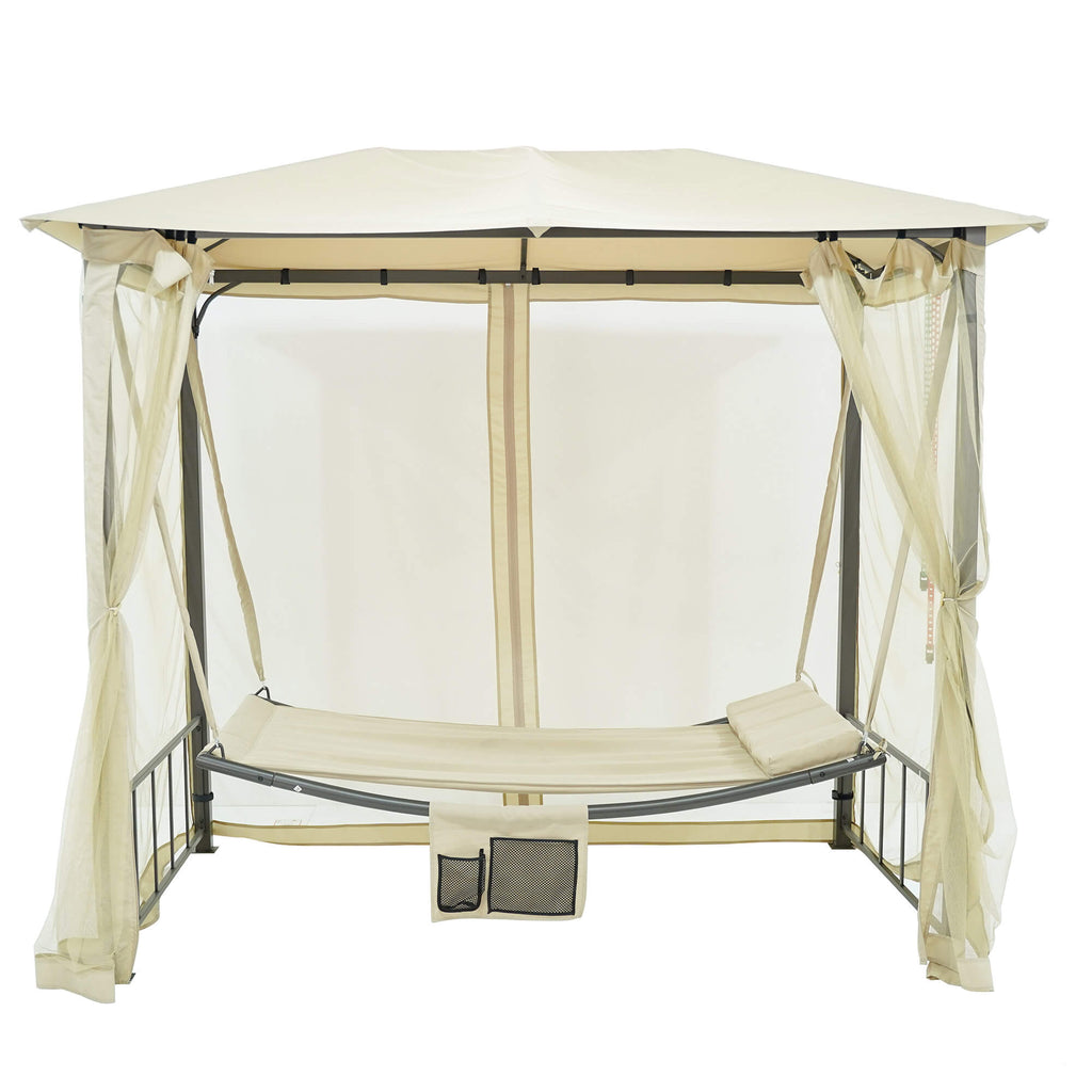 Gazebo da giardino con amaca a dondolo interno. Dotato di Cuscino e sacca porta oggetti resistenti all'acqua per il massimo comfort e Zanzariera per proteggersi dagli insetti.