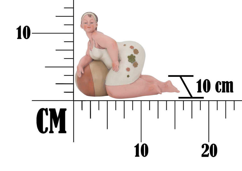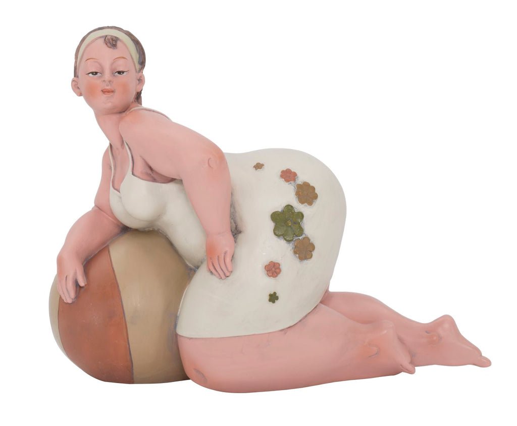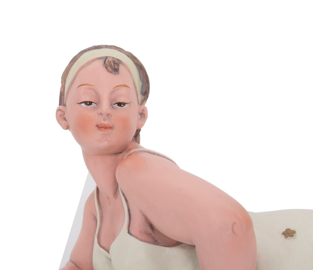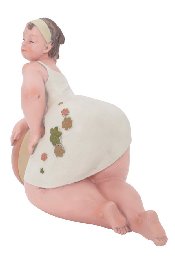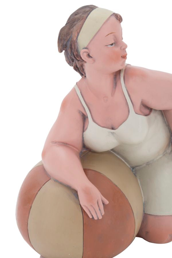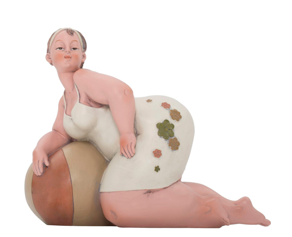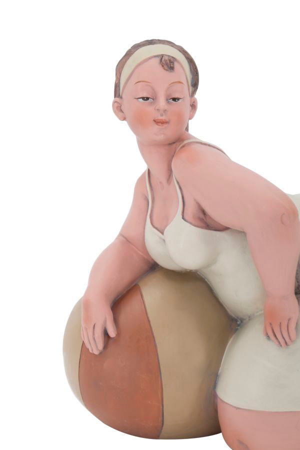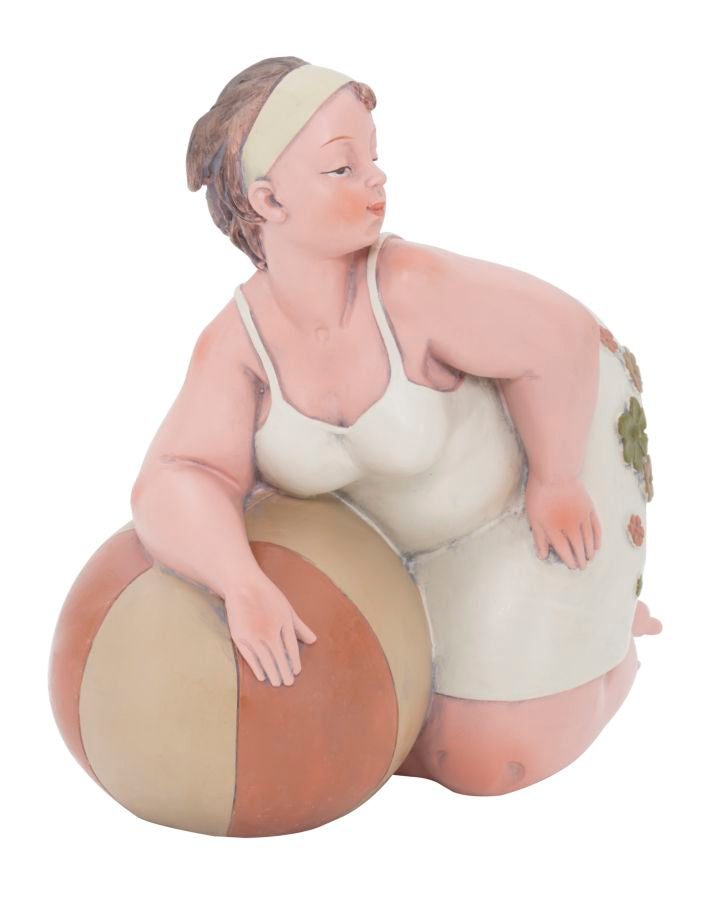 Statua di donna con pallone da spiaggia. L'abbigliamento tradizionale richiama il cinema italiano neorealista degli anni 60. Eleganti decor realizzati in resina consentono di donare un tocco di personalità alla propria casa o diventano ottime idee regalo.
