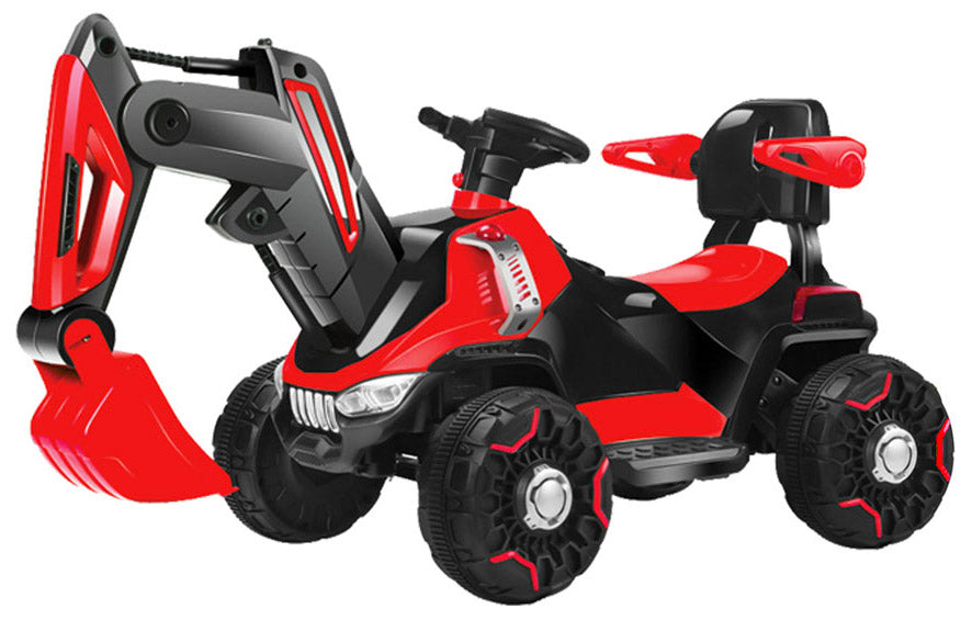 Ruspa elettrica per bambini con batteria 6 Volt e luci. Escavatore elettrico per bambino rosso, con braccio meccanico e funziona scavatrice. La Ruspa ha un potente motore di azionamento e una batteria da 6V che garantiscono prestazioni di guida potenti per un lungo periodo di tempo. L'escavatore è dotato di musica, luci a led, braccio meccanico, funziona scavatrice e retromarcia. Inoltre il braccio Scavatore può essere sollevato e abbassato con l'uso dei comandi posti sul volante.