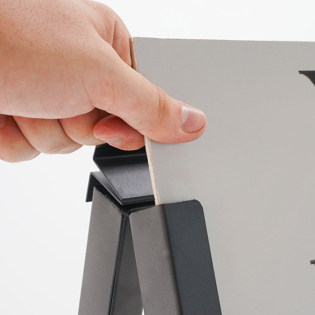 La lavagna a cavalletto bifacciale è realizzata in metallo verniciato nero per garantire robustezza e durata nel tempo. I piedini di protezione in gomma evitano graffi e danni ai pavimenti. Dotata di profili con inserto per la grafica e un profilo superiore apribile, questa lavagna permette di inserire facilmente un pannello promozionale di dimensioni 90x120 cm. Le dimensioni complessive della lavagna sono di 90,5x126x76 cm, rendendola adatta per spostamenti e trasporti agevoli.
