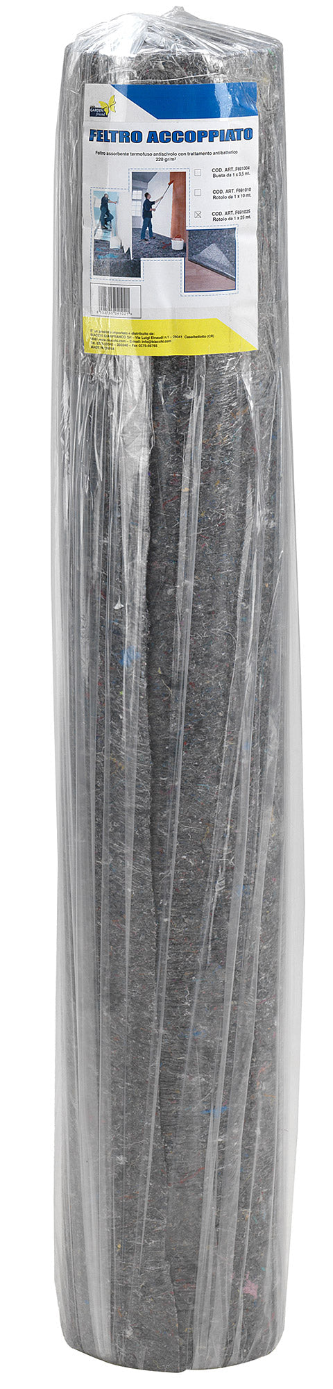 Feltro assorbente termofuso 220 gr/m2 con base antiscivolo in polietilene 40gr/m2 privo di clorofluorocarburi, metalli pesanti, formaldeide, funghicidi e pesticidi. Confezionato in rotolo.