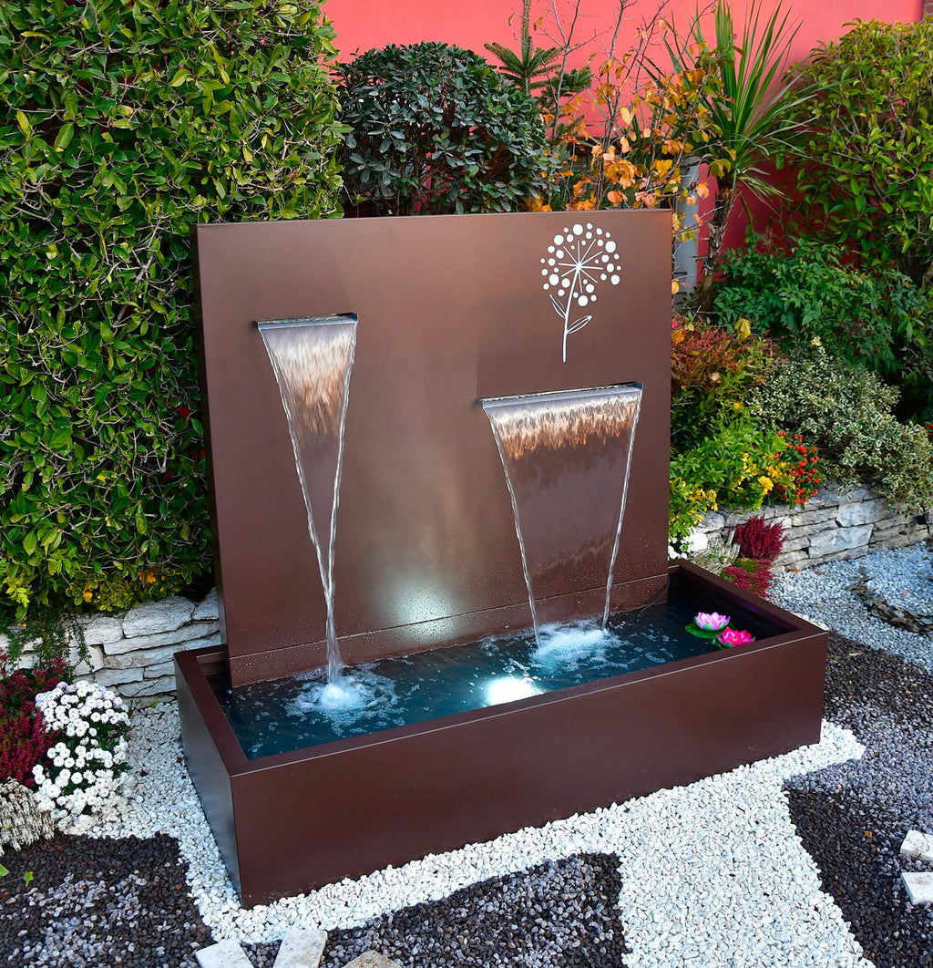 Maestosa ed elegante questa fontana a cascata è realizzata da artigiani italiani in metallo verniciato color corten. La fontana è composta da un bacino di raccolta e da una parete con due lame d’acqua.