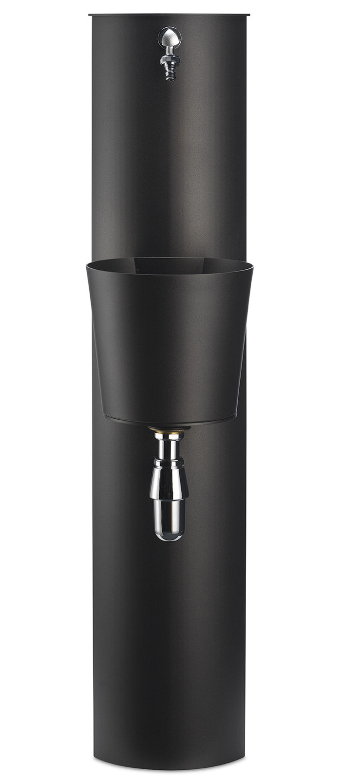 Fontana da giardino a parete dal design innovativo e originale, 42/PRT con Rubinetto e Secchio della Belferche permette l'installazione con allacciamenti acqua/scarico ad altezze variabili: altezza allacciamento acqua da 0 fino 116cm, altezza allacciamento scarico da 0 fino 55 cm.