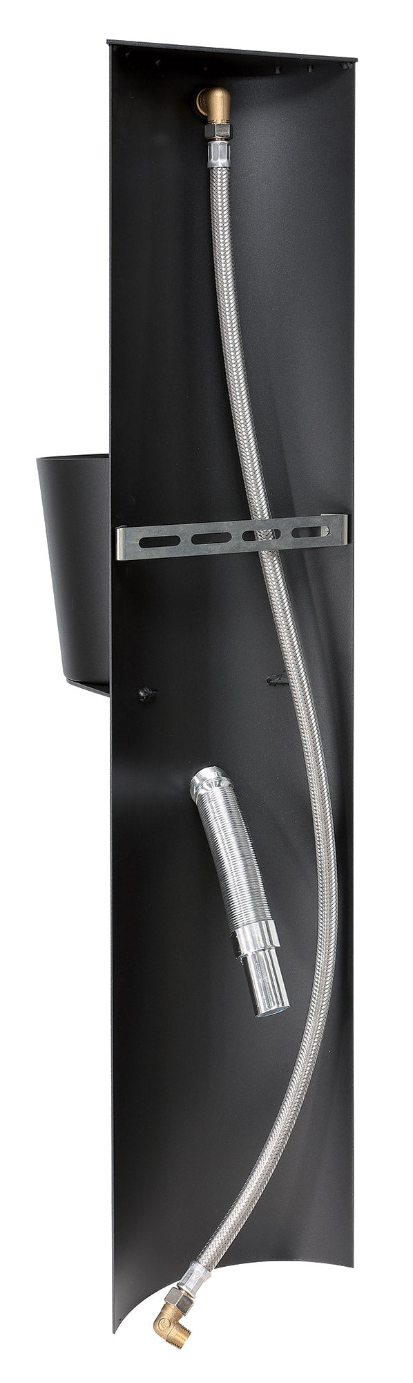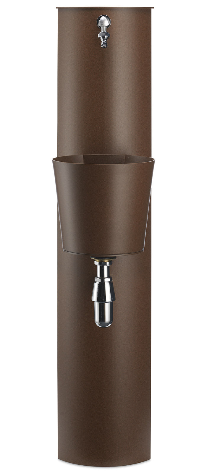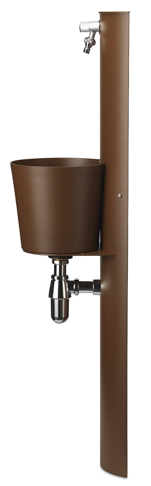 Fontana da giardino a parete dal design innovativo e originale, 42/PRT con Rubinetto e Secchio della Belferche permette l'installazione con allacciamenti acqua/scarico ad altezze variabili: altezza allacciamento acqua da 0 fino 116cm, altezza allacciamento scarico da 0 fino 55 cm.