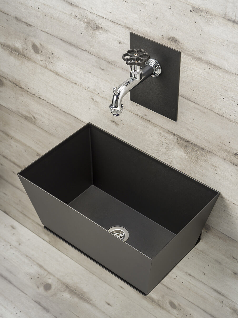 Fontana a parete da giardino dal design innovativo e originale, 42/PRQ con Rubinetto e Vasca Rettangolare della Belfer.