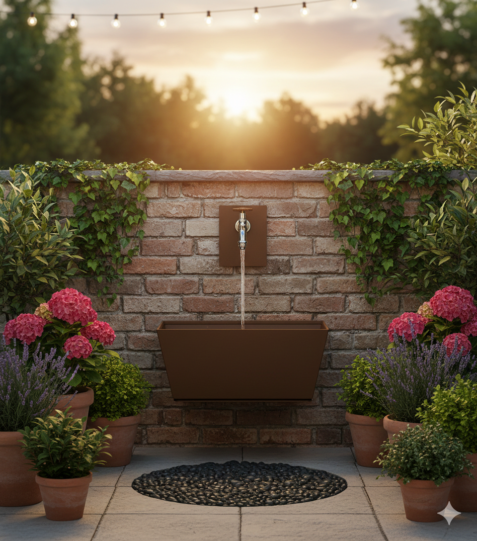 Fontana a parete da giardino dal design innovativo e originale, 42/PRQ con Rubinetto e Vasca Rettangolare della Belfer.