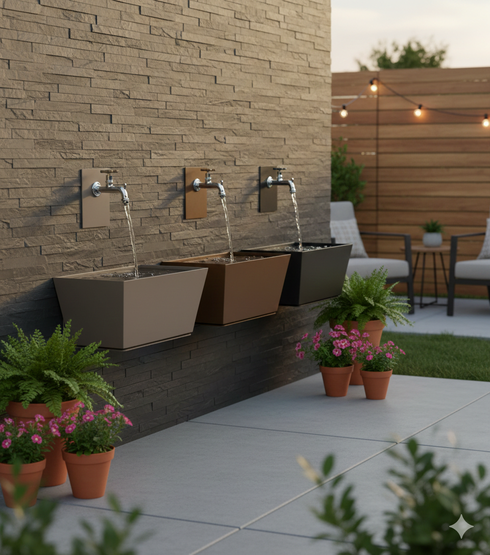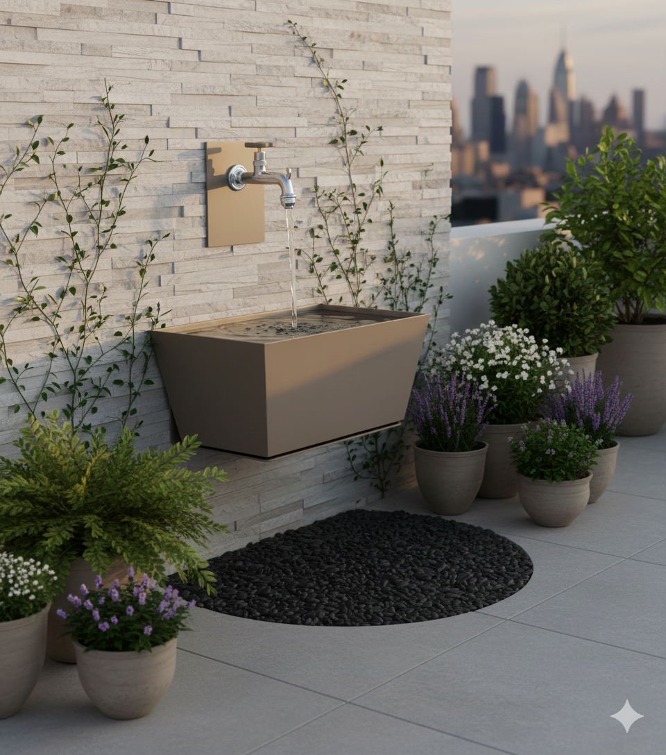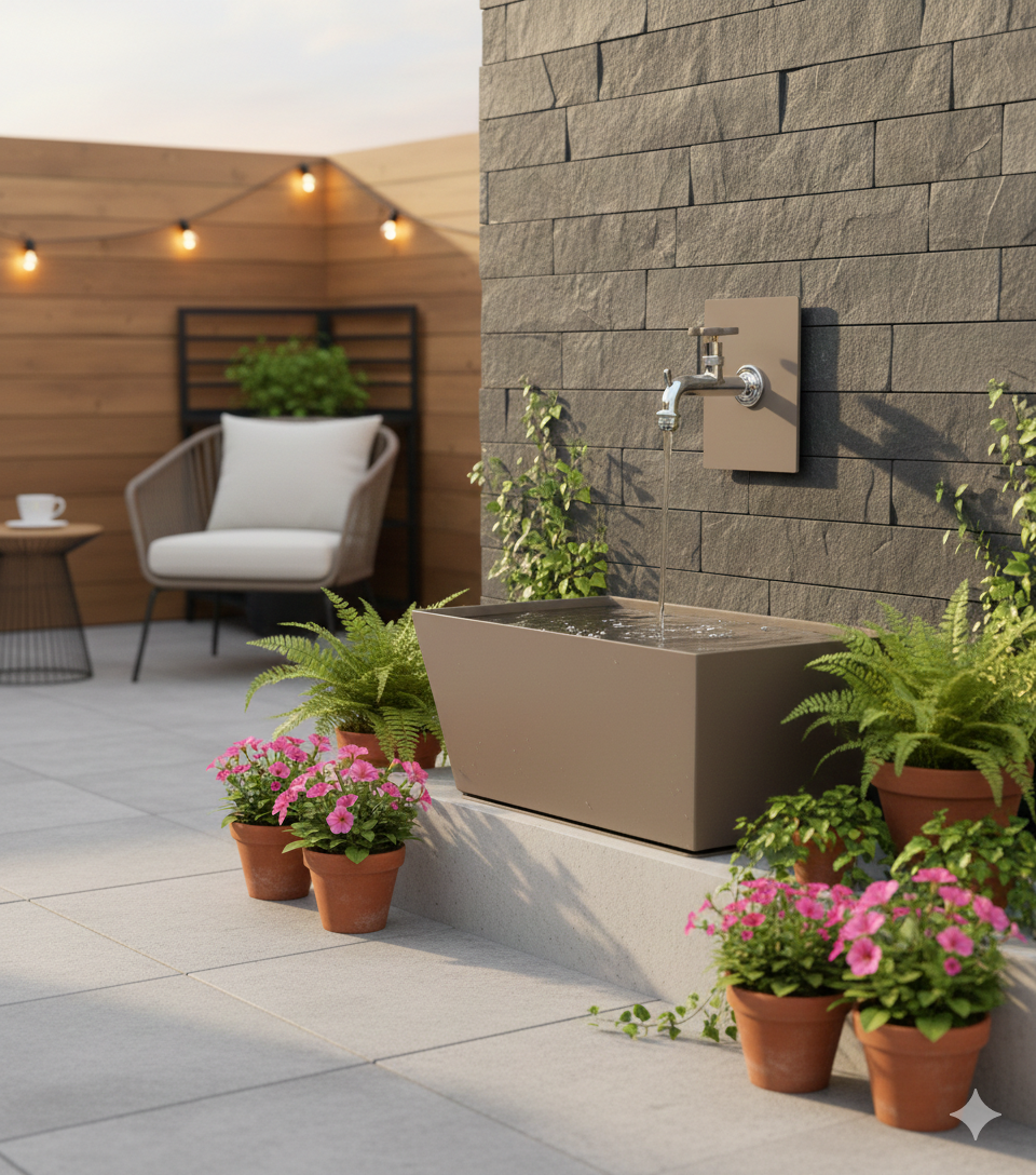 Fontana a parete da giardino dal design innovativo e originale, 42/PRQ con Rubinetto e Vasca Rettangolare della Belfer.
