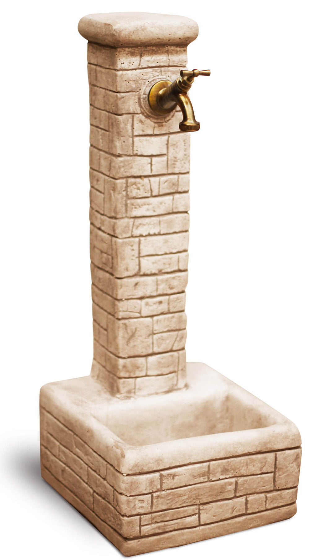 Fontana da giardino in cemento e granulato di marmo La fontana da giardino Modello Iglesias dona un tocco rustico ad ogni giardino. Realizzata in cemento e granuto di marmo bianco. All'interno della colonna è predisposta la tubazione da 1/2" che porta l'acqua al rubinetto. Alla fontana può essere abbinato qualunque rubinetto con attacco M 1/2". Prodotto 100% Made in Italy