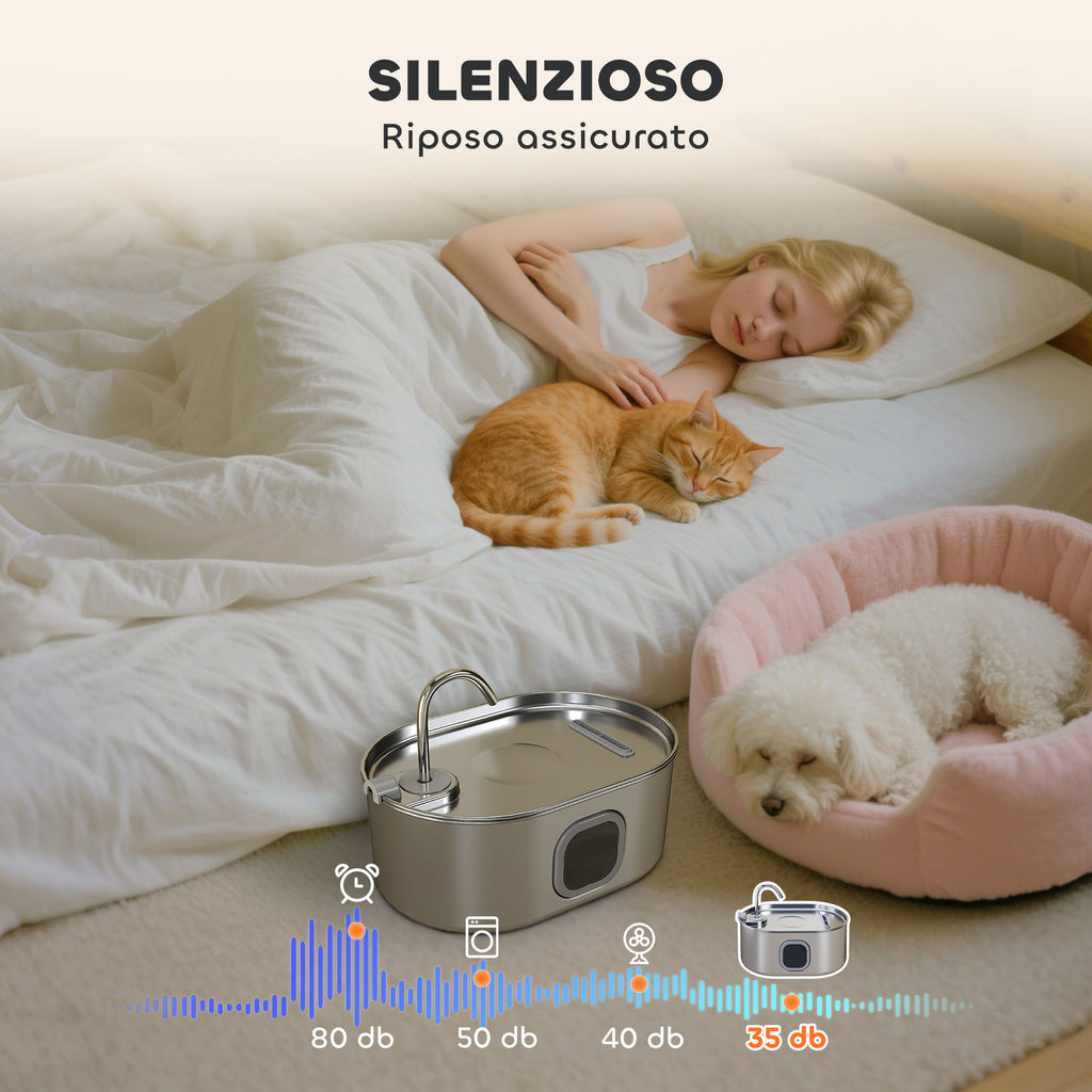 - IN ACCIAIO INOX: Realizzata in acciaio inox 304 di alta qualità, questa fontana per gatti è facile da pulire ed è più salutare. Il design igienico impedisce la formazione di macchie scure sul mento dei gatti, assicurando una bevuta più igienica e sicura