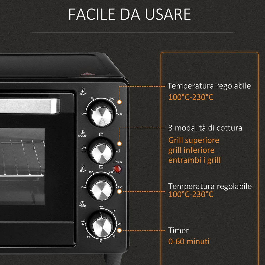 - TEMPERATURA REGOLABILE e TIMER: La temperatura del fornetto elettrico si regola facilmente da 100°C a 230°C ed è presente un pratico timer da 60 minuti.