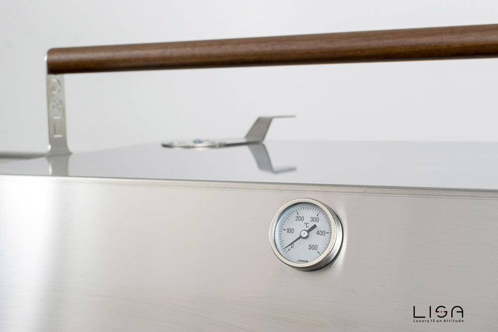 - Un coperchio, con termometro integrato per il controllo della temperatura del forno e una maniglia impreziosita da un elegante inserto in legno di noce canaletto