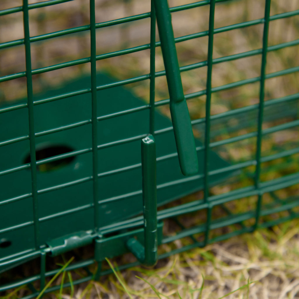 Questa gabbia trappola per animali ha un design a un ingresso ed è dotata di un meccanismo di chiusura molto sensibile ma allo stesso tempo sicuro, per catturare gli animali senza ferirli. Può essere utilizzata sia in ambienti esterni che interni ed è costruita in fili d'acciaio riverniciati. Facile da pulire e asciugare, è di colore verde scuro, ideale per confondersi con la vegetazione.
