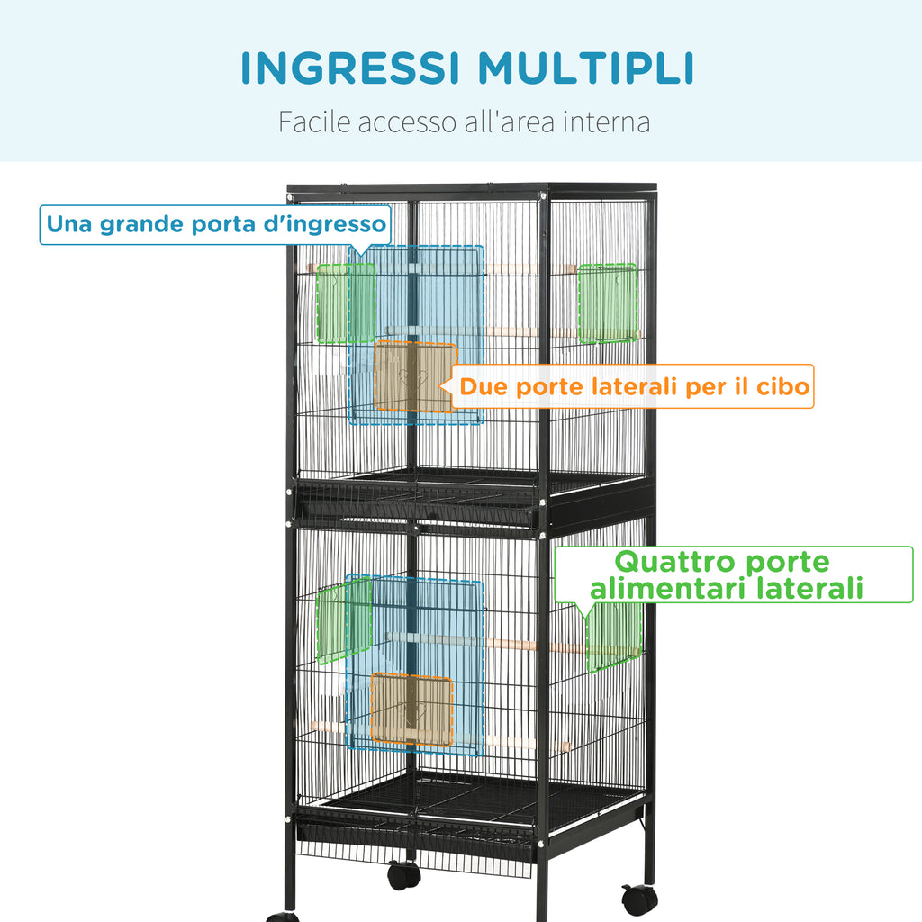 Gabbia Voliera per Uccelli per Interni 51,5x50x140 cm con Ruote e Vassoi Estraibili Nero