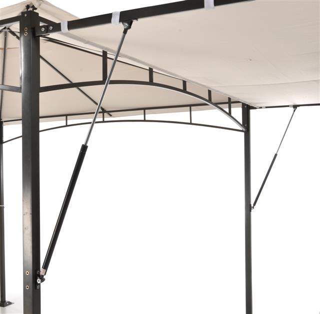 Vela con ventilazione e doppia tettoia pieghevole con sistema di apertura/chisura a pistoncini a gas, struttura in Ferro verniciata a polvere colore Grigio scuro, tessuto tetto Poliestere gr. 250/mq colore Beige rivestito in PU (Poliuretano) tessuto tettoia Poliestere gr. 160/mq cm 300 X 300, tettoia cm 300 X 219 sezione gambe mm 45 X 45 X 0.8 sezione paleria traverse mm 20 X 20 sezione paleria tetto mm 15 X 15 Sistema di apertura/chisura tettoia con pistoncini a gasGazebo a Vela da Giardino 3x3m Telo in Poliuretano con Chiusura a Gas e Ventilazione Taddei Razzaq Beige