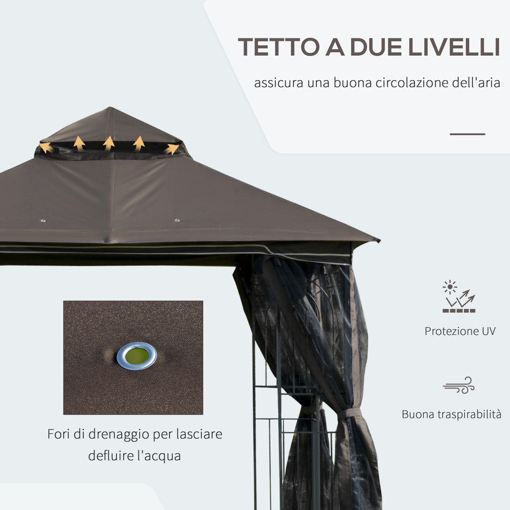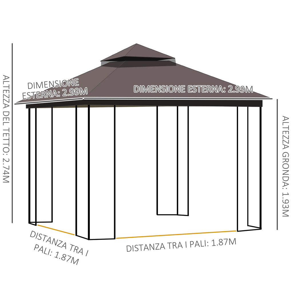 Gazebo da Giardino 3x3m con Zanzariera in Metallo Caffè