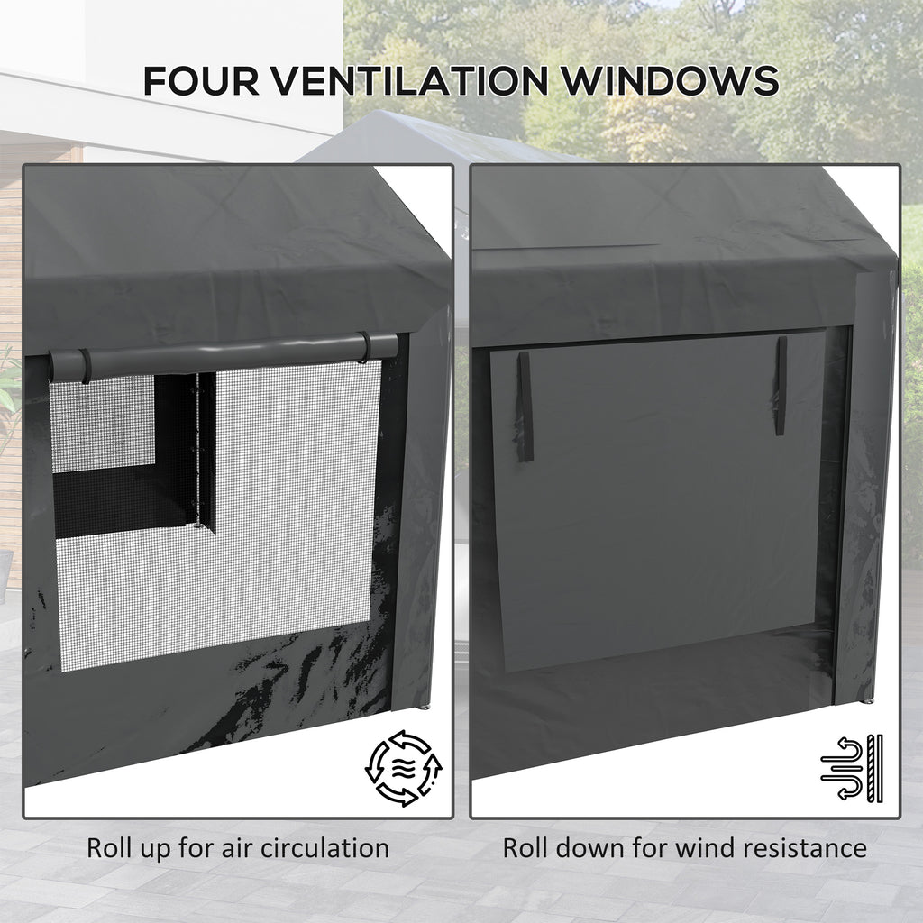 - 4 PORTE E 4 FINESTRE: Questo gazebo auto è dotato di grandi porte a cerniera che ti consentono di aprirlo e chiuderlo facilmente. Sono presenti anche 4 finestre che garantiscono un passaggio ottimale dell'aria e che puoi coprire con le tende integrate e avvolgibili