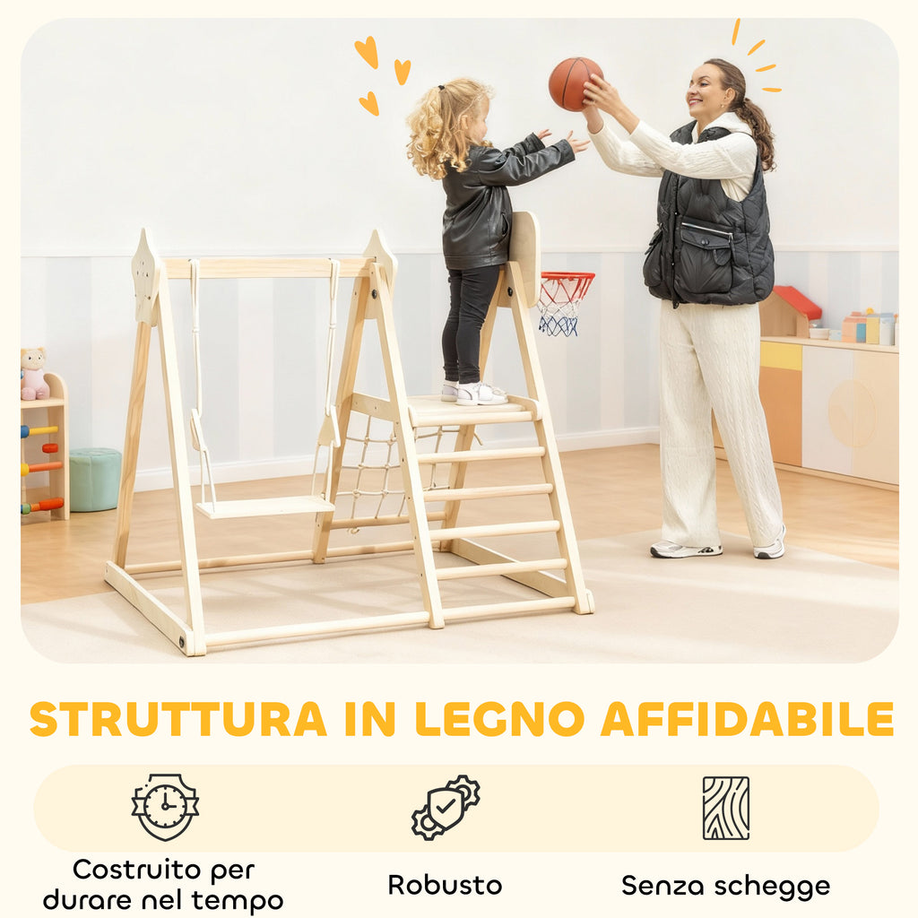 Il nostro gioco arrampicata per bambini porta spazio avventuroso direttamente tra le mura domestiche, mettendo i più piccoli alla prova e testando le loro abilità. La struttura è costruita in legno resistente ed è dotata di altalena, scivolo, parete da arrampicata, canestro e parete scalabile. Questo gioco favorisce l'equilibrio, la coordinazione e l'indipendenza infantile, trasformando i momenti di gioco in preziose occasioni di autostima e sviluppo.