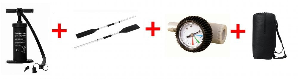 Coppia di remi in alluminio, pompa doppia azione, cuscino gonfiabile e borsa trasporto incluse.