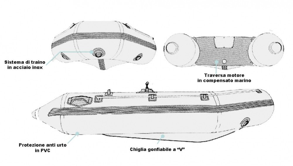 Tubolari in PVC laminato triplo strato e Pagliolato in Air-Deck in PVC ad alta resistenza.