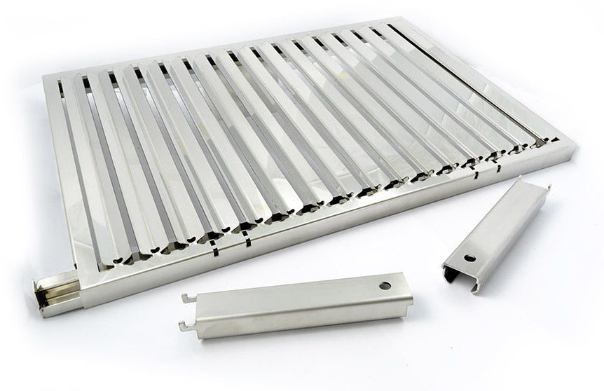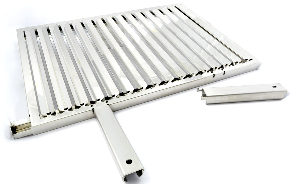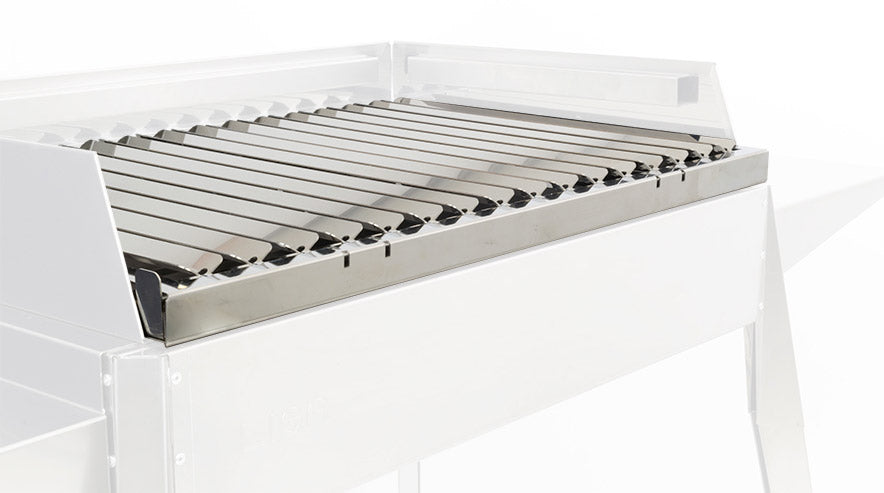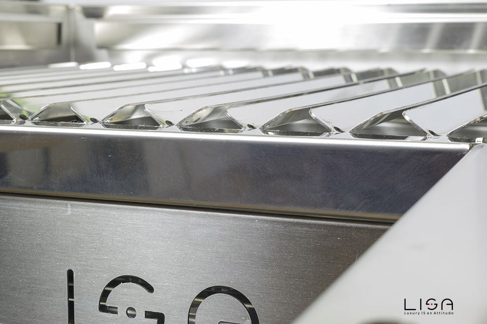 La Griglia in acciaio inox per barbecue con sistema di recupero grassi. E' infatti realizzata in acciaio inossidabile AISI 304, adatta al contatto diretto con gli alimenti. La superficie delle lamelle, con profilo a V, è lisciata e lucidata a specchio per facilitare lo scorrimento dei liquidi di cottura verso la vaschetta di raccolta, oltre ad agevolare la pulizia. Entrambi i manici sono removibili per un uso più pratico durante la cottura. Il gocciolatoio raccogli grasso è sfilabile per essere svuotato e pulito.