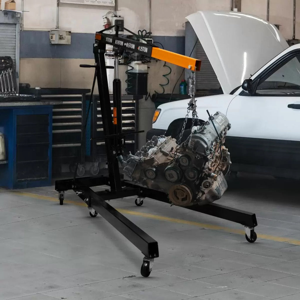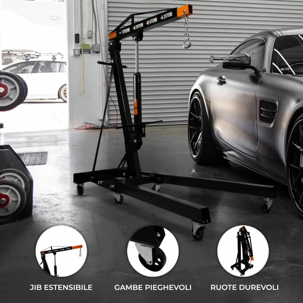 Gru Idraulica per Officine Capacità 1000 Kg con Pompa Idraulica e Ruote Nero
