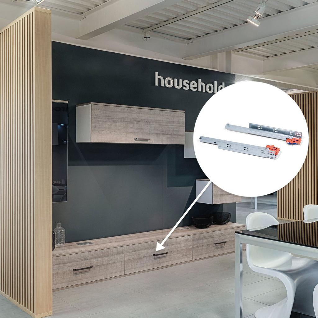 Guide a scomparsa con rotelle per cassetto Slippe ha un'alta qualità e un miglior funzionamento nei mobili per la Casa. Queste guide forniscono un'estrazione totale del cassetto. Dispongono di autochiusura e pistone ammortizzatore in entrambe le guide, che forniscono una chiusura soft del cassetto. Inoltre sono note per avere un aggancio per un montaggio facile e uno smontaggio rapido del cassetto dalle guide.