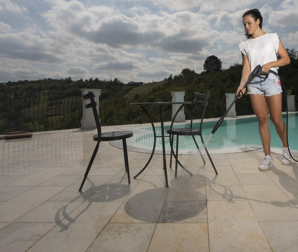 Idropulitrice ideale per la pulizia occasionale di sporco superficiale presente su superfici esterne, cancellate, mobili da giardino, biciclette