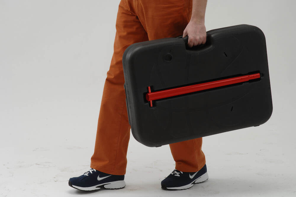 La base si trasforma in una comoda valigetta salvaspazio nella quale riporre tutti i componenti .