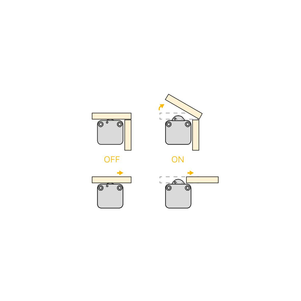 Interruttore per accendere e spegnere le lampade in modo automatico con l'apertura e la chiusura dell'anta. In questo modo l'illuminazione si accende aprendo l'anta e si spegne chiudendo l'anta. È progettata per l'istallazione nei mobili per la Casa e per l'ufficio in modo discreto, grazie alle sue dimensioni ridotte e per il facile montaggio avvitandolo alla superficie del mobile. Inoltre l'interrutore per anta si adatta ai mobili con ante tanto battente come scorrevole.