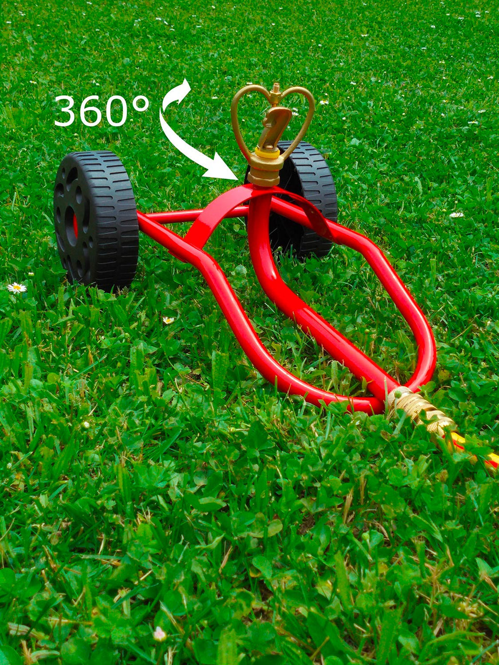 Portairrigatore con ruote, realizzato in acciaio verniciato con polvere poliestere. Dotato di attacco universale in ottone ed irrigatore girevole in ottone con rotazione su sfere in acciaio inox: con pressione acqua di 2 BAR l'area irrigata ha un diametro di circa 8,5 metri. Le ruote permettono di spostare e riposizionare, tirando il tubo che collega il portairrigatore al rubinetto dell'acqua, il portairrigatore senza interrompere l'irrigazione né calpestare il prato.