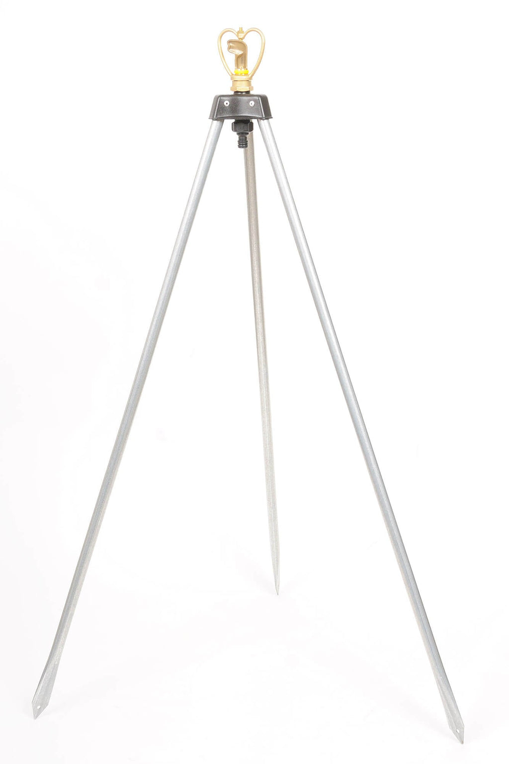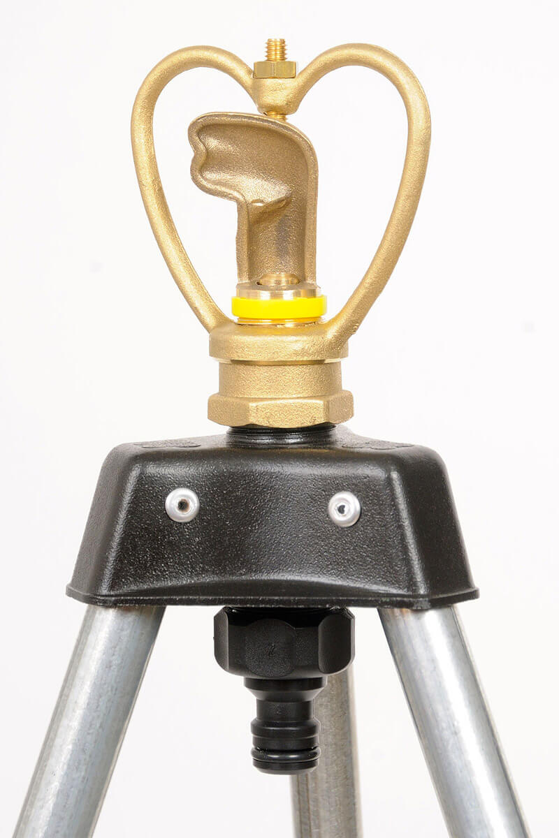 Treppiede con irrigatore rotante (rotazione 360°), per l'irrigazione uniforme di giardini e orti. Il treppiede è realizzato in acciaio zincato, con terminali a punta per il posizionamento stabile sul terreno. L'irrigatore è realizzato in ottone, ed è dotato di cuscinetto a sfere di acciaio per assicurare il perfetto funzionamento: con pressione di alimentazione acqua di 2 bar (pressione generalmente fornita dalle reti idriche per uso domestico) questo irrigatore può coprire un'area circolare di circa 9 metri di diametro. Dotato di attacco rapido universale per il collegamento alla rete idrica. Il treppiede è alto 60 cm. circa.