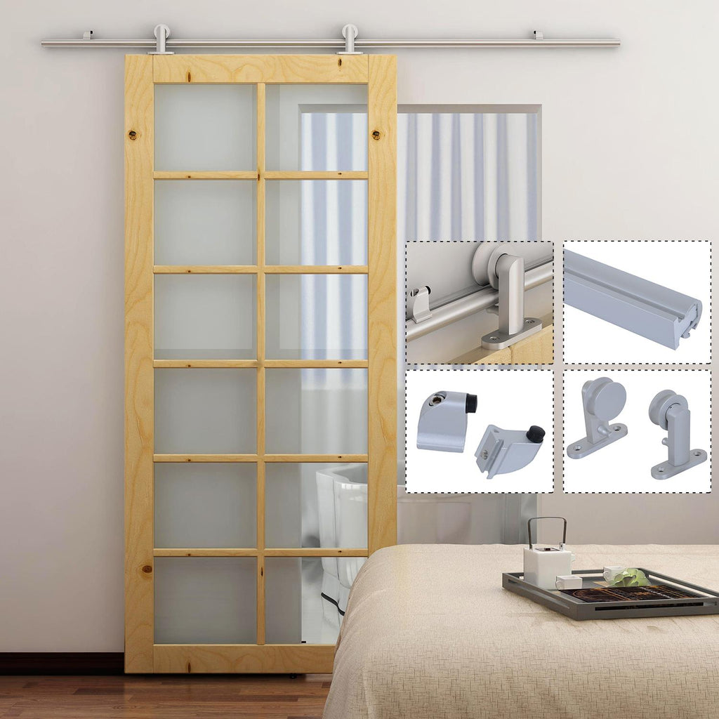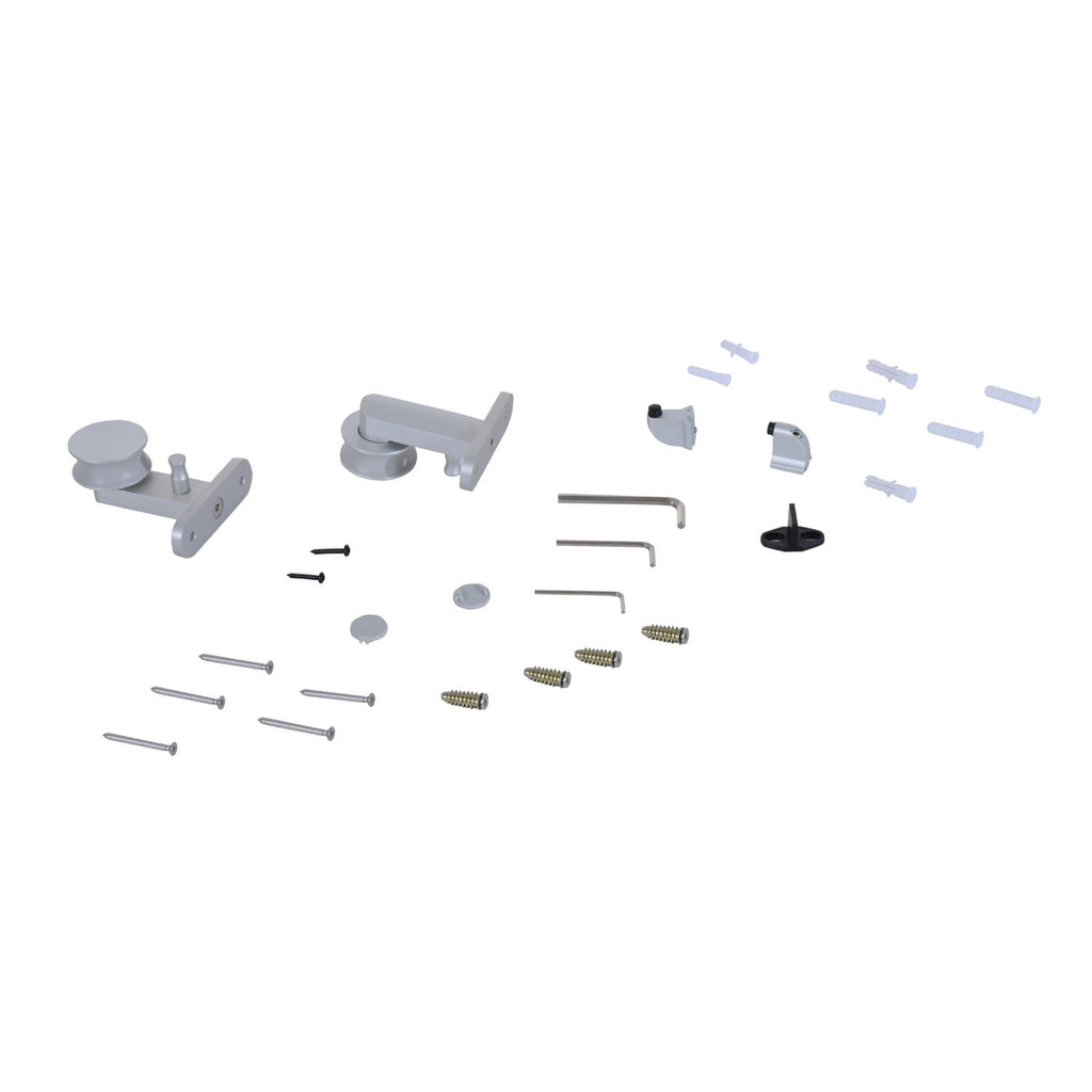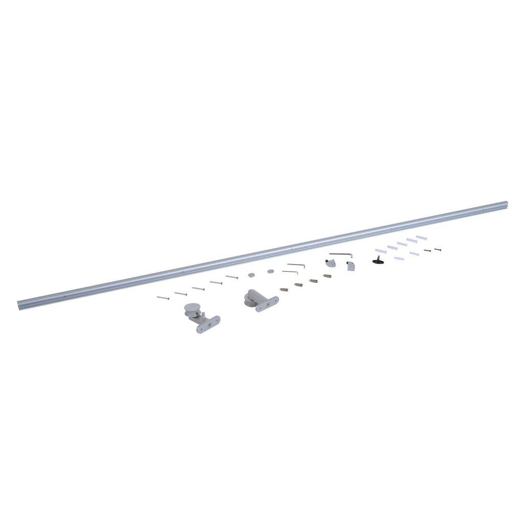 Questo kit per il montaggio di porte scorrevoli è composto da un binario in lega d'alluminio, 2 supporti bracciolo, un fermo, una guida pavimento e tutti gli altri accessori per il montaggio.