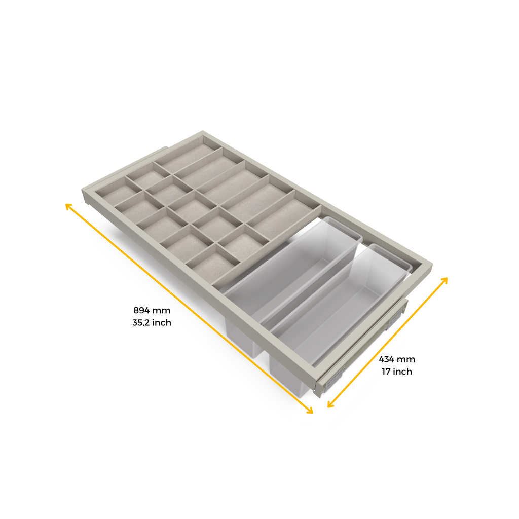 Questo kit comprende tutto il necessario per assemblare 1 telaio (1 telaio in alluminio, 1 set di guide, 1 set di tappi di copertura in plastica e 8 viti Ø4x16mm) e 1 cassetto organizzatore in legno con finitura tessile grigio pietra e texture in velluto.