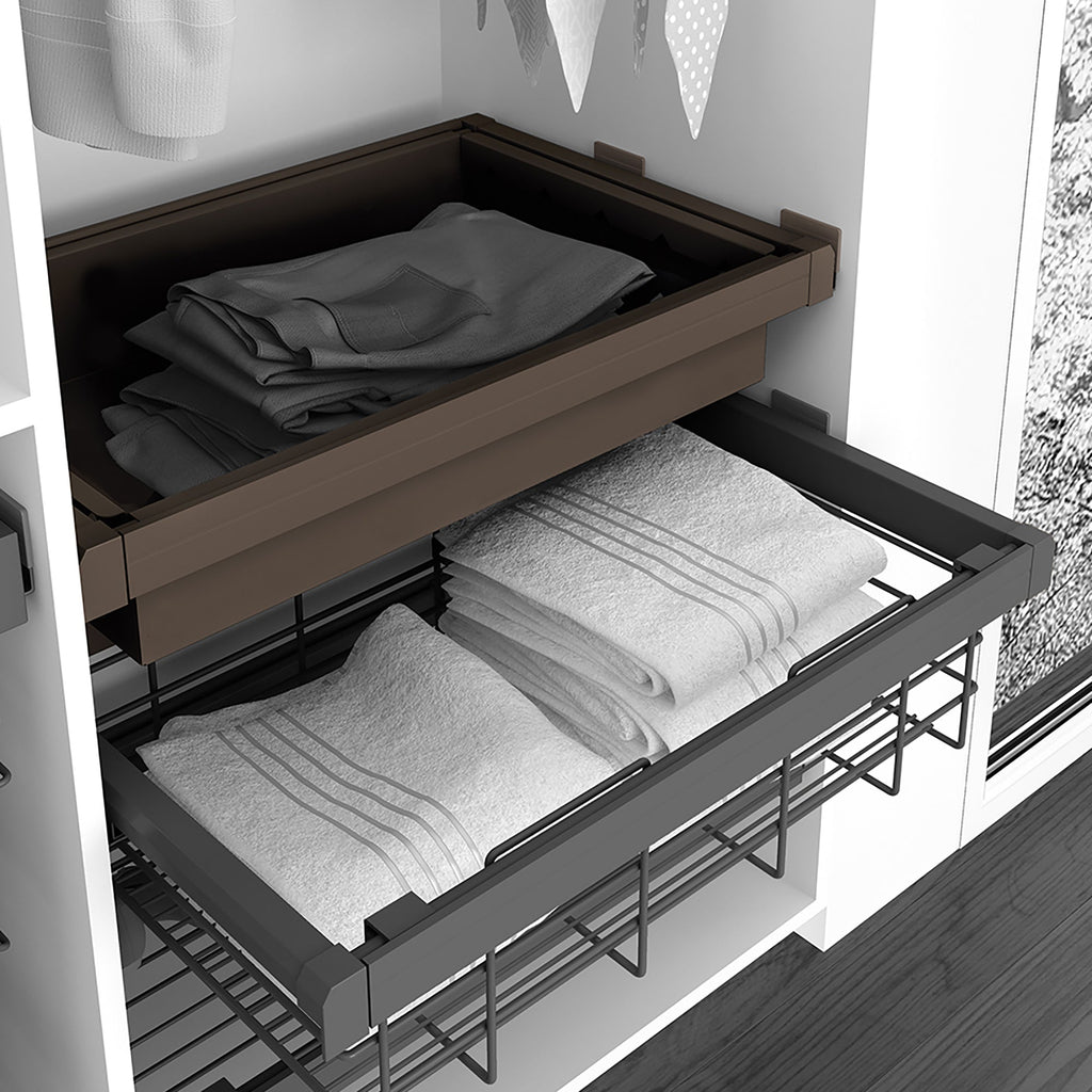 Kit composto da un casssetto metallico e telaio con guide a scomparsa con estrazione totale e chiusura soft, inoltre ha un sistema di clip automato e rapido per l'installazione del telaio. È regolabile per essere adattato al vano interno dell'armadio e sono prodotti in alluminio verniciato moka. Invece, il cassetto è in acciaio con finitura verniciata moka