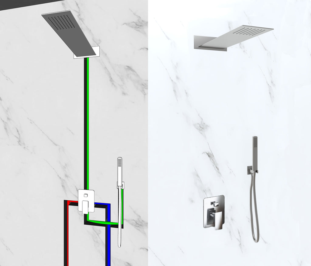L'impianto va predisposto installando il miscelatore da incasso fornito e predisponendo le uscite per il soffione e per il doccino.