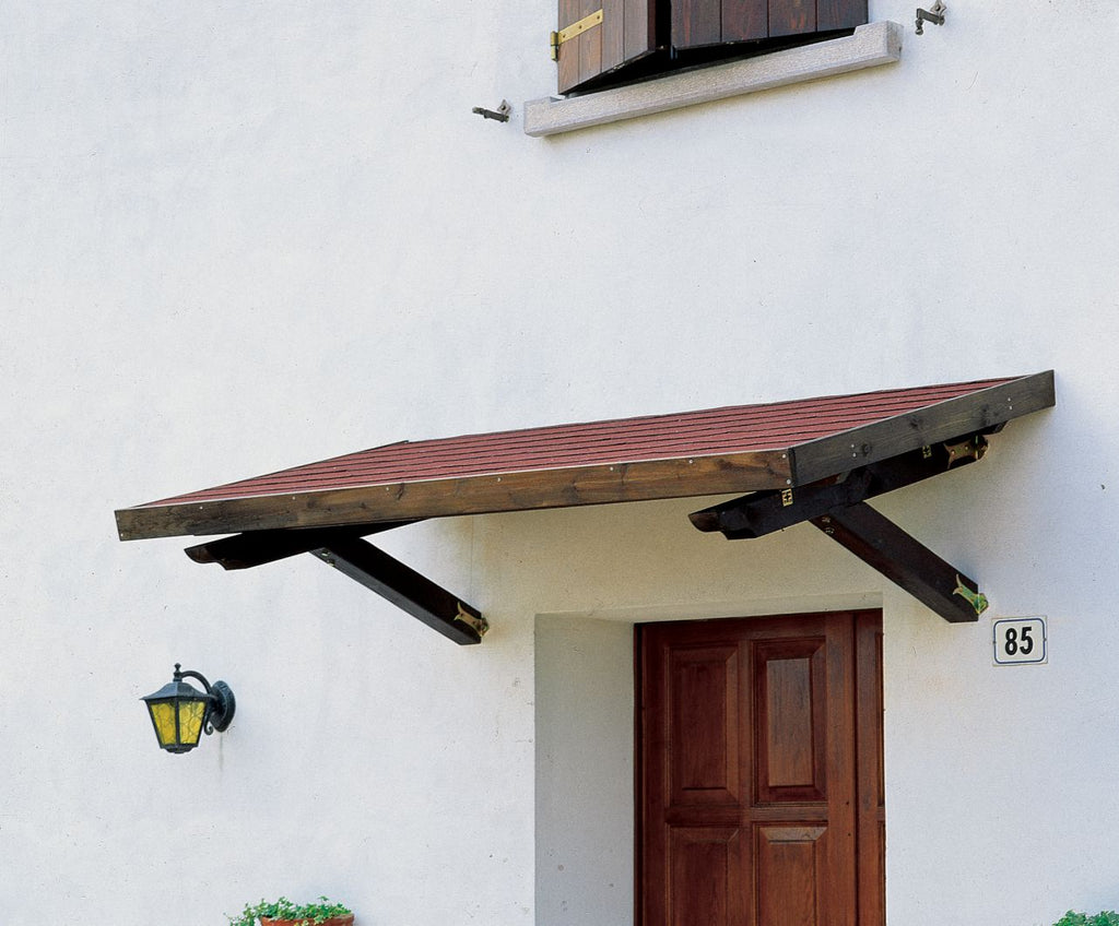 Pino di Svezia impregnato in autoclave e tinteggiato color noce, il kit o?= costituito da mensole sez. 9x9 cm e profili per la copertura, tegola canadese rossa, fascione perimetrale e ferramenta per il montaggio (tasselli a muro esclusi), le mensole vengono fornite preforate e comprensive della ferramenta e delle staffe per il fissaggio a muro (tasselli ad espansione esclusi).