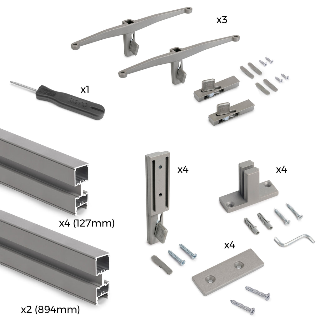 Il kit comprende i profili Zero necessari per realizzare questa composizione da 900 mm e 127 mm, i componenti di fissaggio, i giunti, 3 set di supporti per ripiani in legno e uno strumento che permette la regolazione in altezza o lo smontaggio degli accessori Zero.