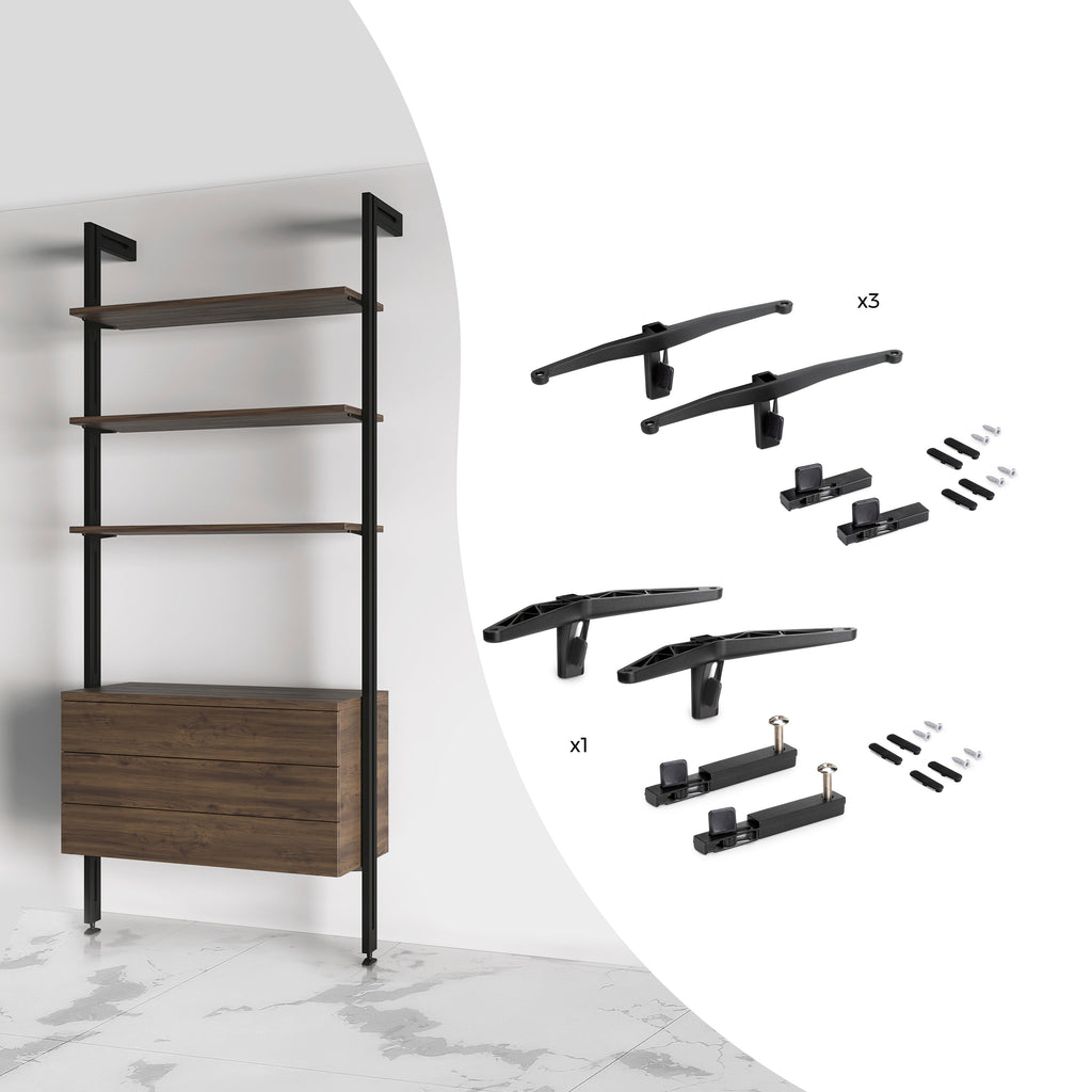 Kit di supporti per la struttura modulare Zero, composto da 3 set di supporti per ripiani in legno e 1 set di supporti per modulo. Include tutti gli accessori per montarlo sul profilo