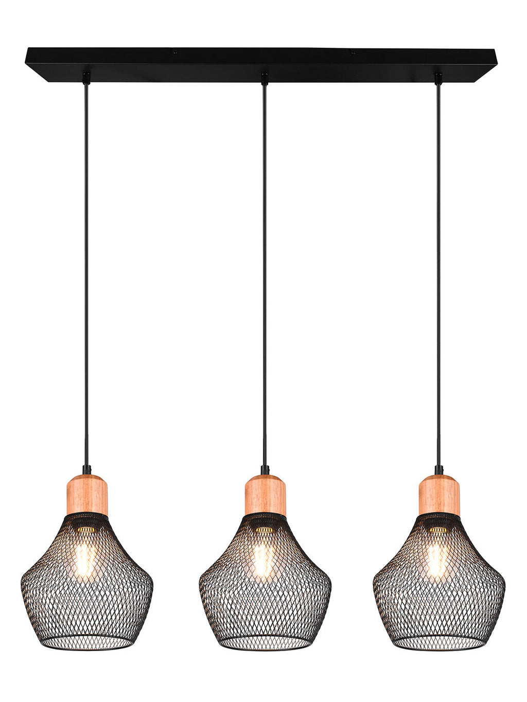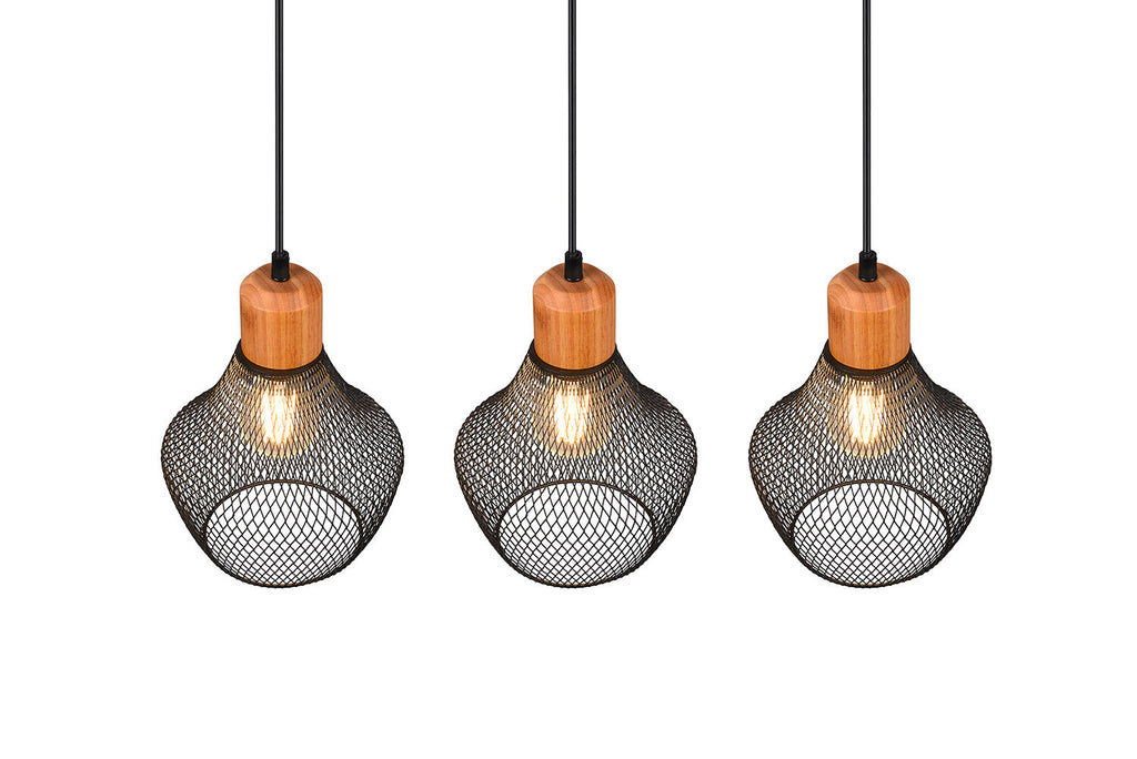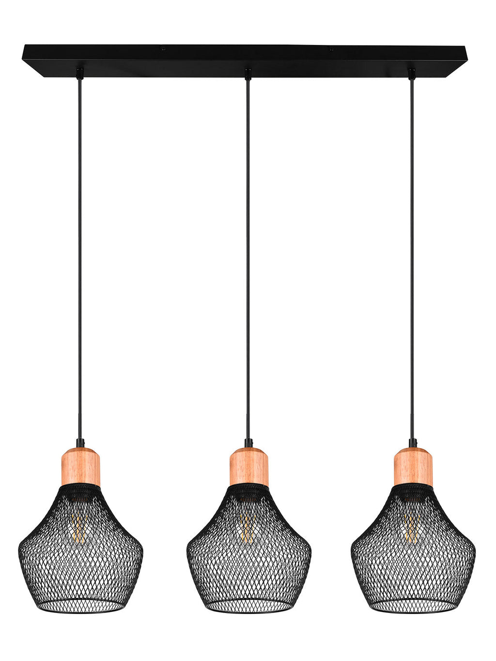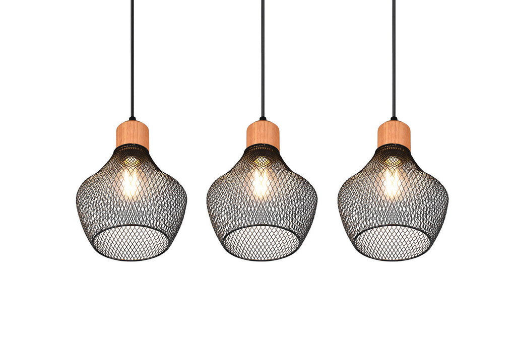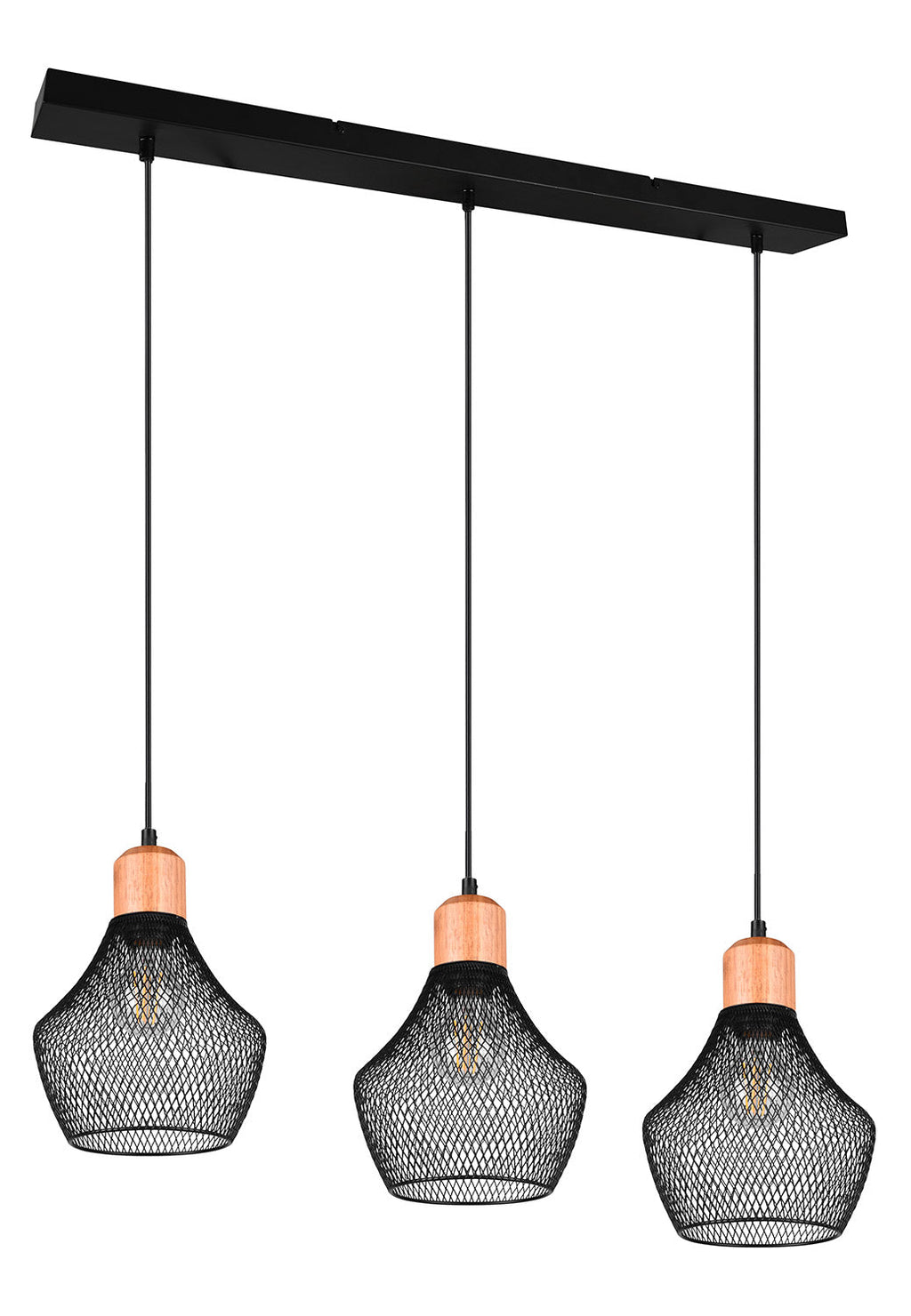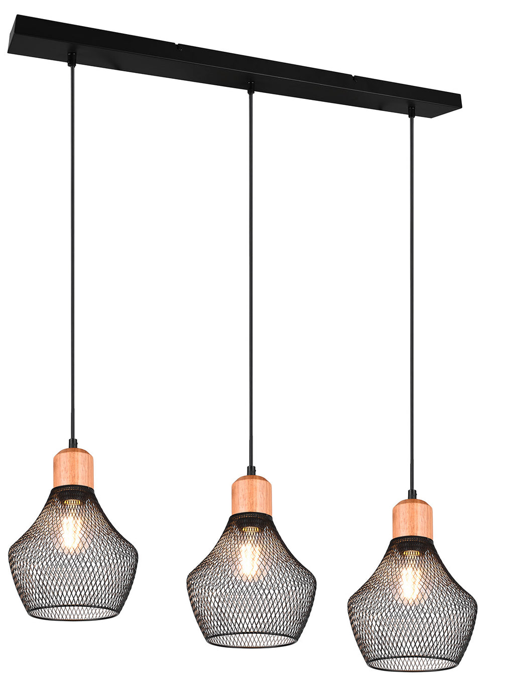 Valeria Sospensione Metallo 3 Gabbie Nere con Particolari in Legno Naturale L. 80Cm