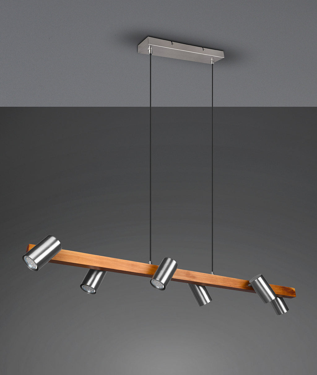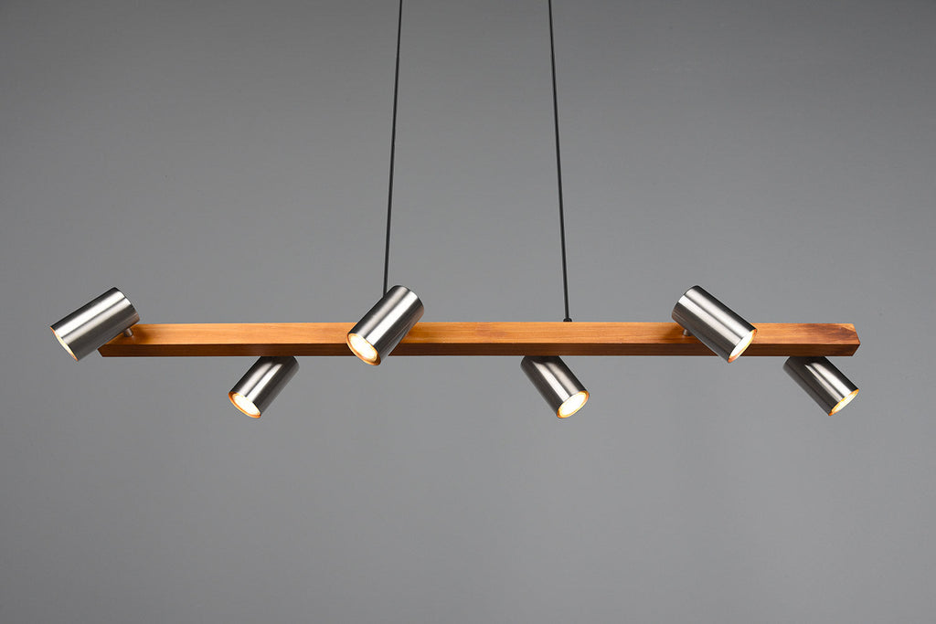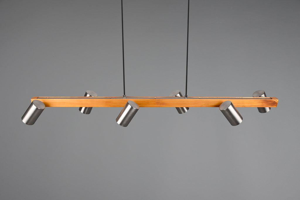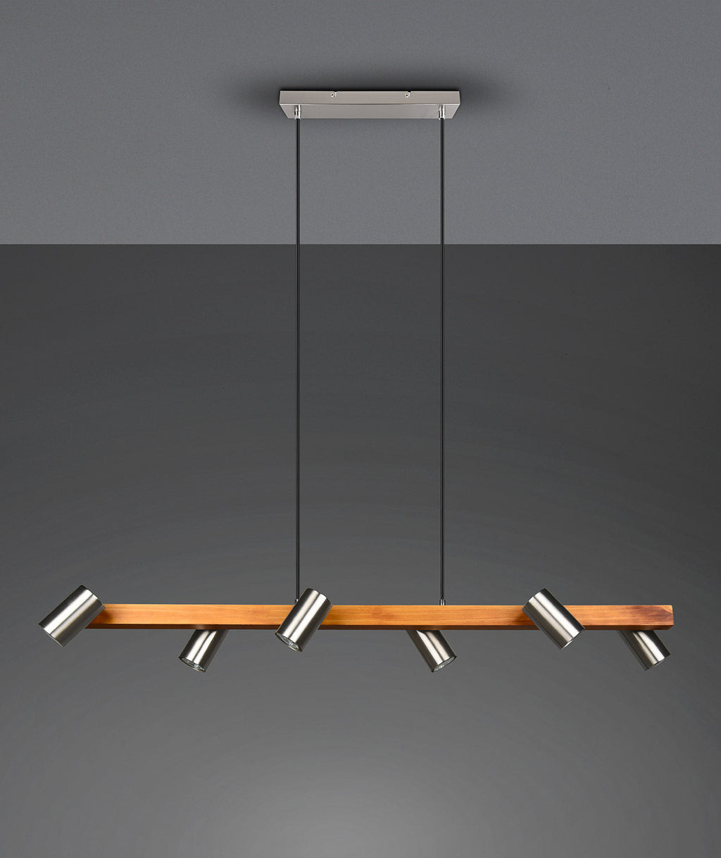 Marley Sospensione Rettangolare con Barra Legno 6 Cilindri Acciaio Satinato L. 115Cm