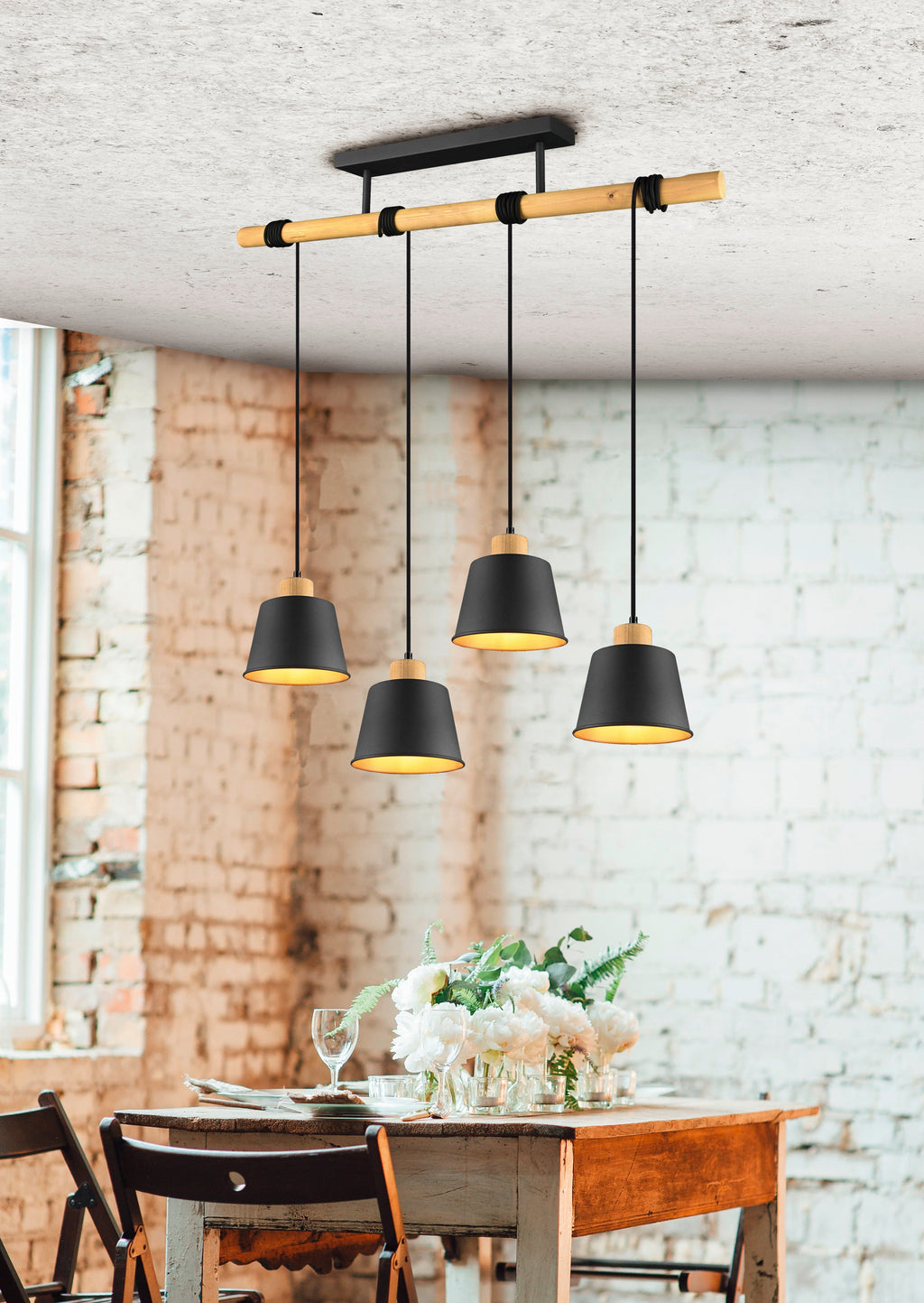 Harris Sospensione 4 Diffusori Metallo Nero Interno Oro Con Struttura E Particolari In Legno Naturale L. 85Cm