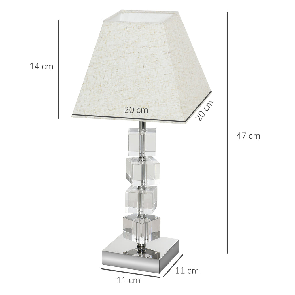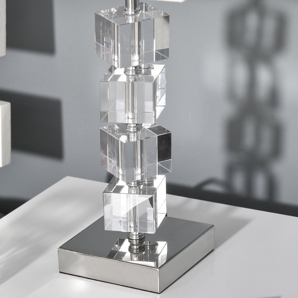 Porta un tocco di stile alla tua casa con la lampada da tavolo moderna di . Il palo con cubi in vetro girevoli rende la lampada scintillante e grazie alla base ampia rimane stabile e ben bilanciata. Il paralume in tessuto dona un effetto di calore alla luce, che rende la lampada ideale da utilizzare anche come abat jour da comodino e come lampada da scrivania. Il lungo cavo di alimentazione ti permette di posizionarla facilmente dove preferisci.