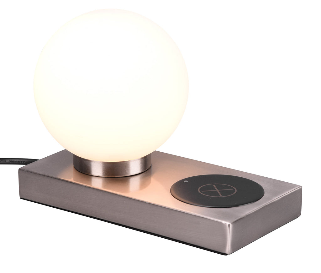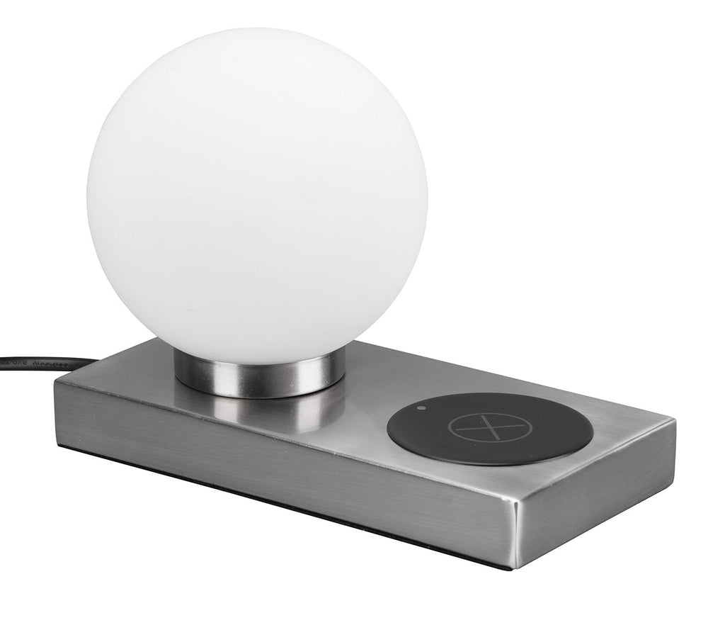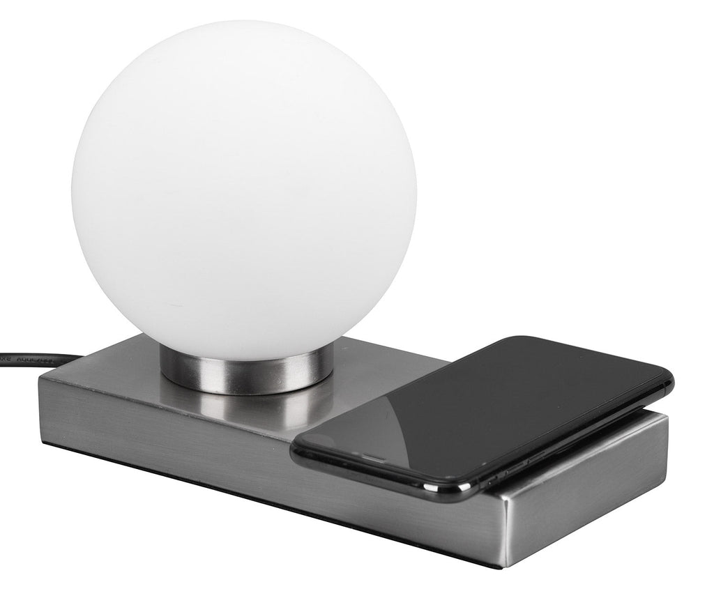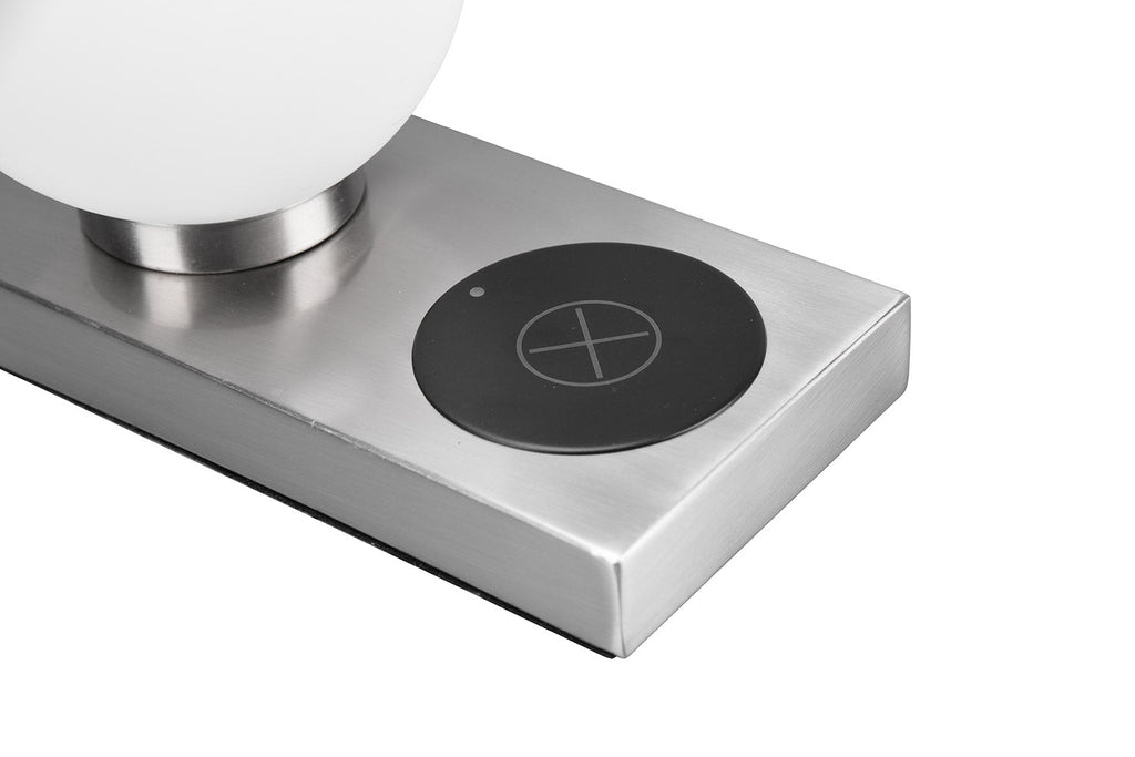 Chloe Lampada Da Tavolo Acciaio con Sfera Vetro Bianco con Base X Ricarica Induttiva Cellulare con Interruttore Touch H. 15Cm