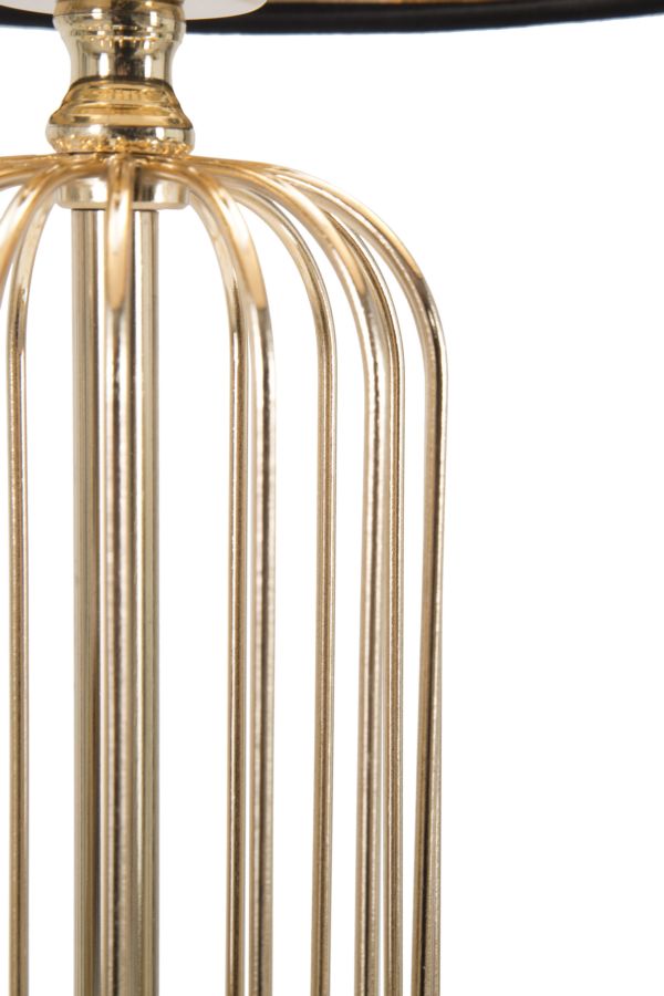 Lampada da tavolo in metallo dorato con paralume in tessuto nero dal design geometrico e ipnotico. Lo stile glam combina dettagli chic e stravaganti. Lampade da tavolo e da terra che si fanno notare per l'abbinamento tra l'oro e colori accesi o colori più dark come l'ardesia e il nero.