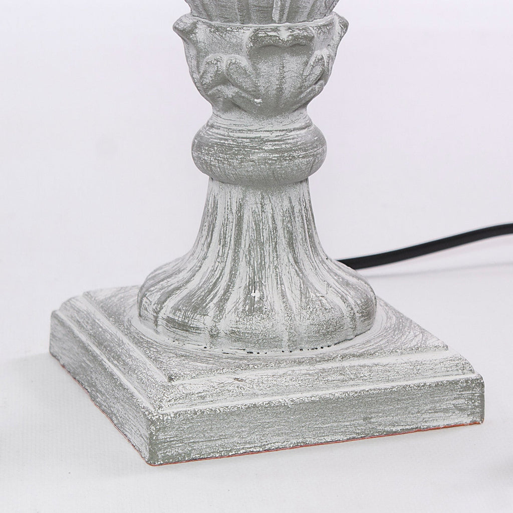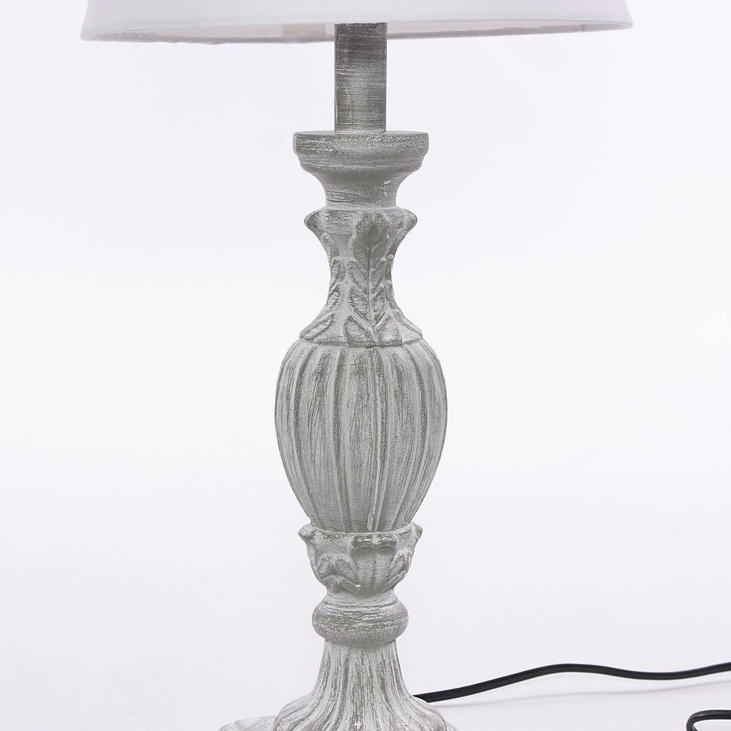Lampada da tavolo grigia in MDF con paralume bianco smontabile in design classico. Lampadina non inclusa. Accensione/spegnimento tramite interruttore a levetta sul cavo