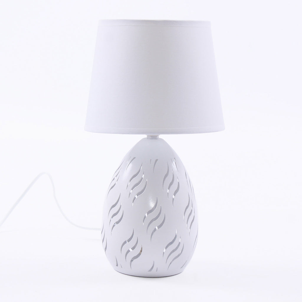 Lampada da tavolo con base bombata a forma di uovo in metallo bianco traforato e cupola bianca in tessuto. Design moderno. Utilizzabile come abatjour per la camera da letto o in ogni ambiente di casa.